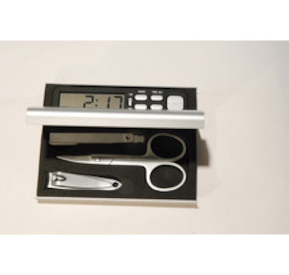 Manicure Travel set with alarm clock. Perfect for executive travel. 11706 Features: -Quality craftsmanship. -Multifunctional. -Perfect gift. -Easy care. -Comes with alarm clock. Product Type: -Bathroom accessory set. Finish: -Black/Silver. Number of Items Included: -3.