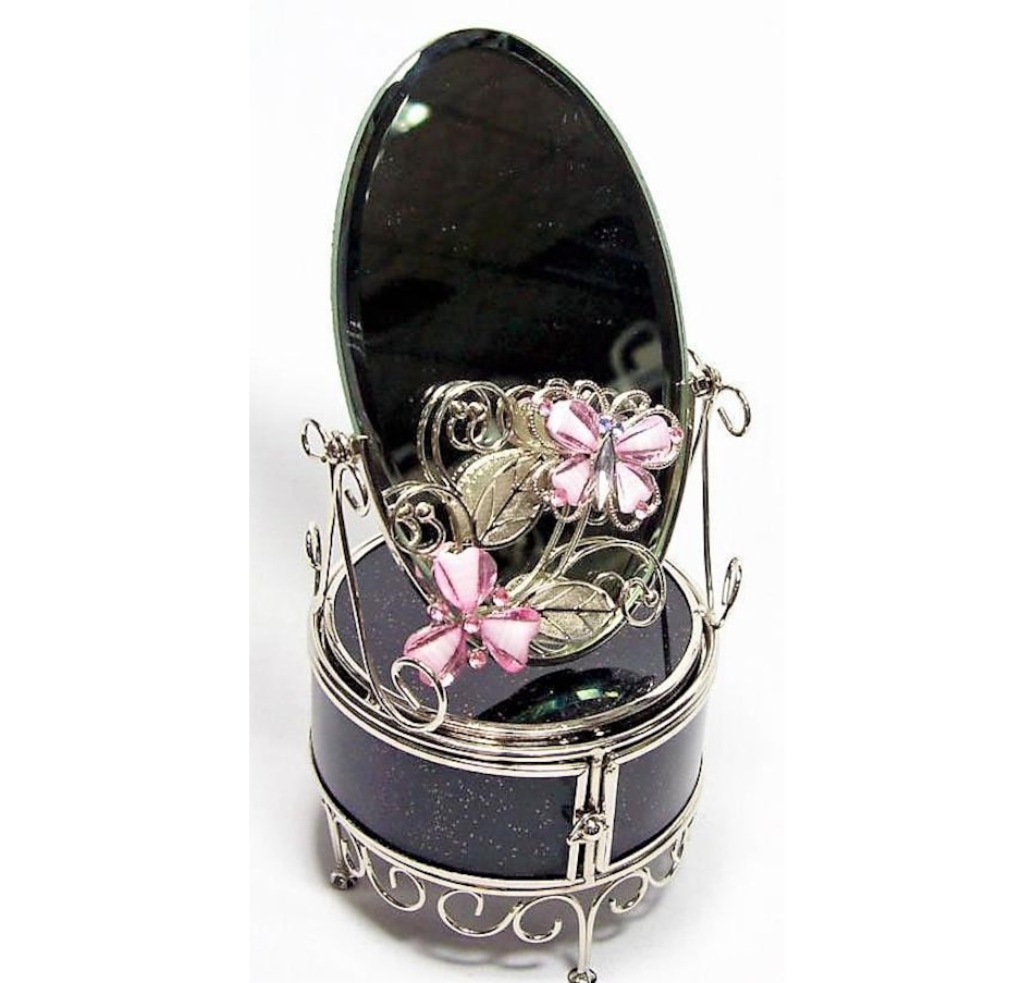 Beautiful Pink butterfly jewelry chest with mirror with two side out doors. Transform the look of your home or office with this Elegance piece. This chest will provide a stunning accent to your decor. With its simple yet elegant design, it can be combined with other home decor for a unique look. A wonderful timeless gift.