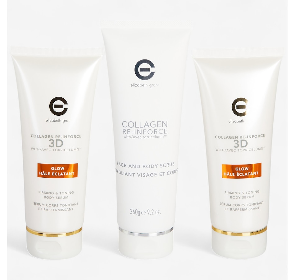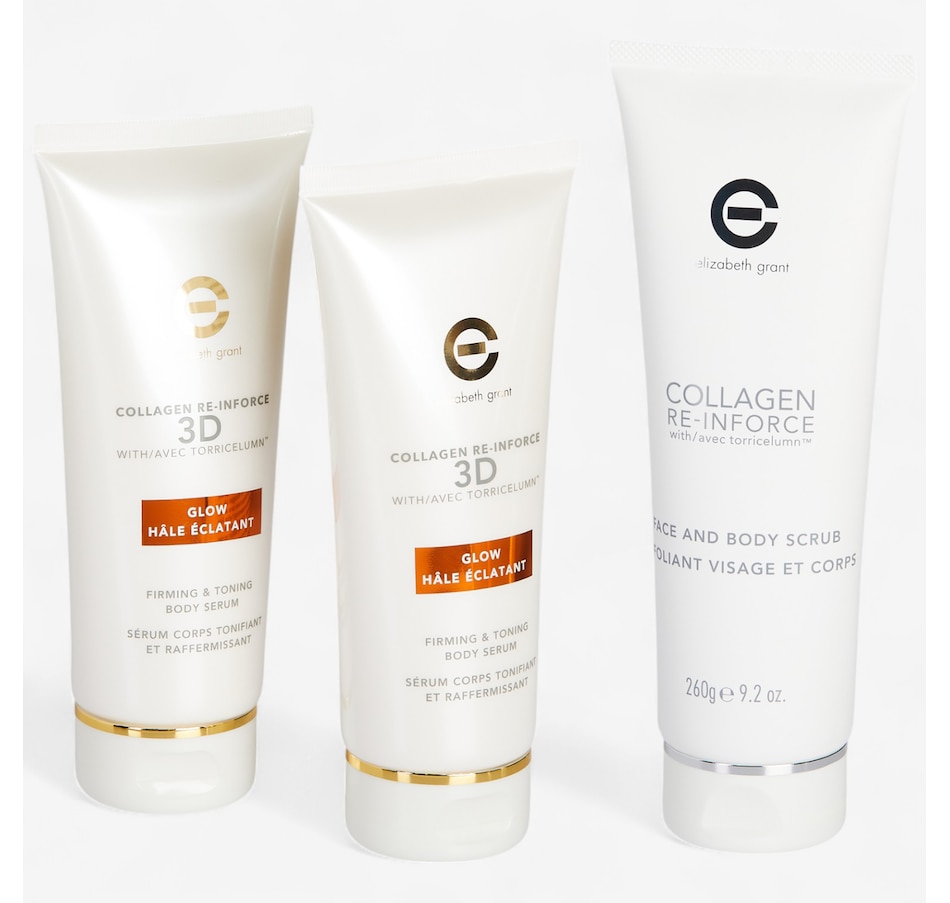 Collagen Re-Inforce Face and Body Scrub moisturizes and exfoliates skin, making it appear more smooth and luminous. Collagen Re-Inforce 3D Firming & Toning Body Serum Glow's silky, fast-absorbing formula is enriched with brown algae extract that helps to strengthen the skin and improve firmness and elasticity for a more lifted look.