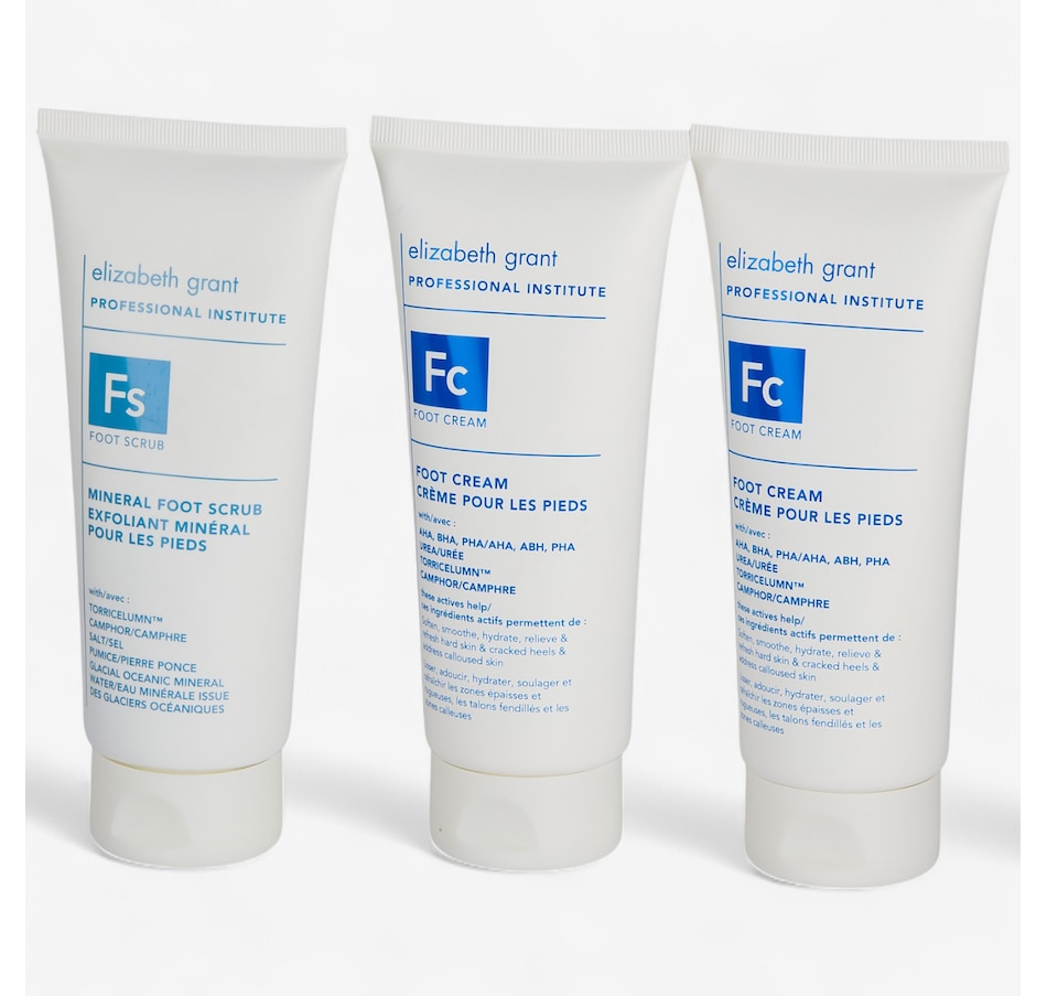 Professional Institute Foot Cream combines skin hydrators including Torricelumn™, Elizabeth Grant's superior moisturizing compound, to help keep the feet hydrated. The Professional Institute Mineral Foot Scrub is a luxurious non-greasy, hardworking foot scrub designed to relieve dryness, cracked heels, and rough skin.