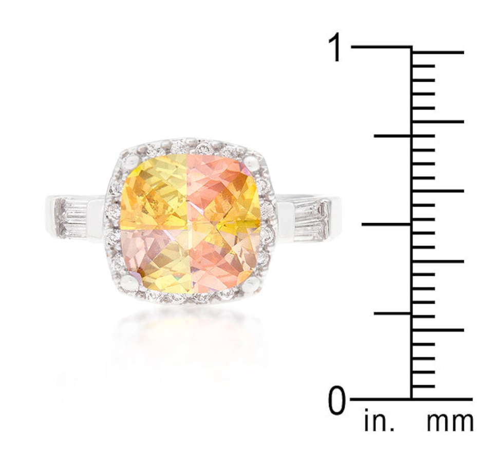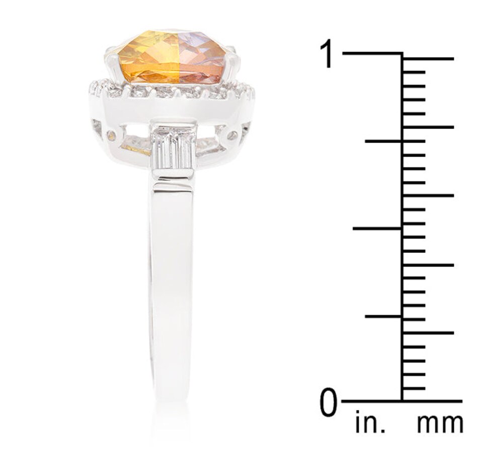 Elle's Ring is a fun cocktail style ring to wear out on the town. Its multicolor faceted center zircon radiates while the pave cubic zirconia clusters brighten and make this ring pop. Genuine Plating is achieved using an electroplating process that coats the item with heavy layers of a close cousin to platinum which gives our jewelry a platinum luster.