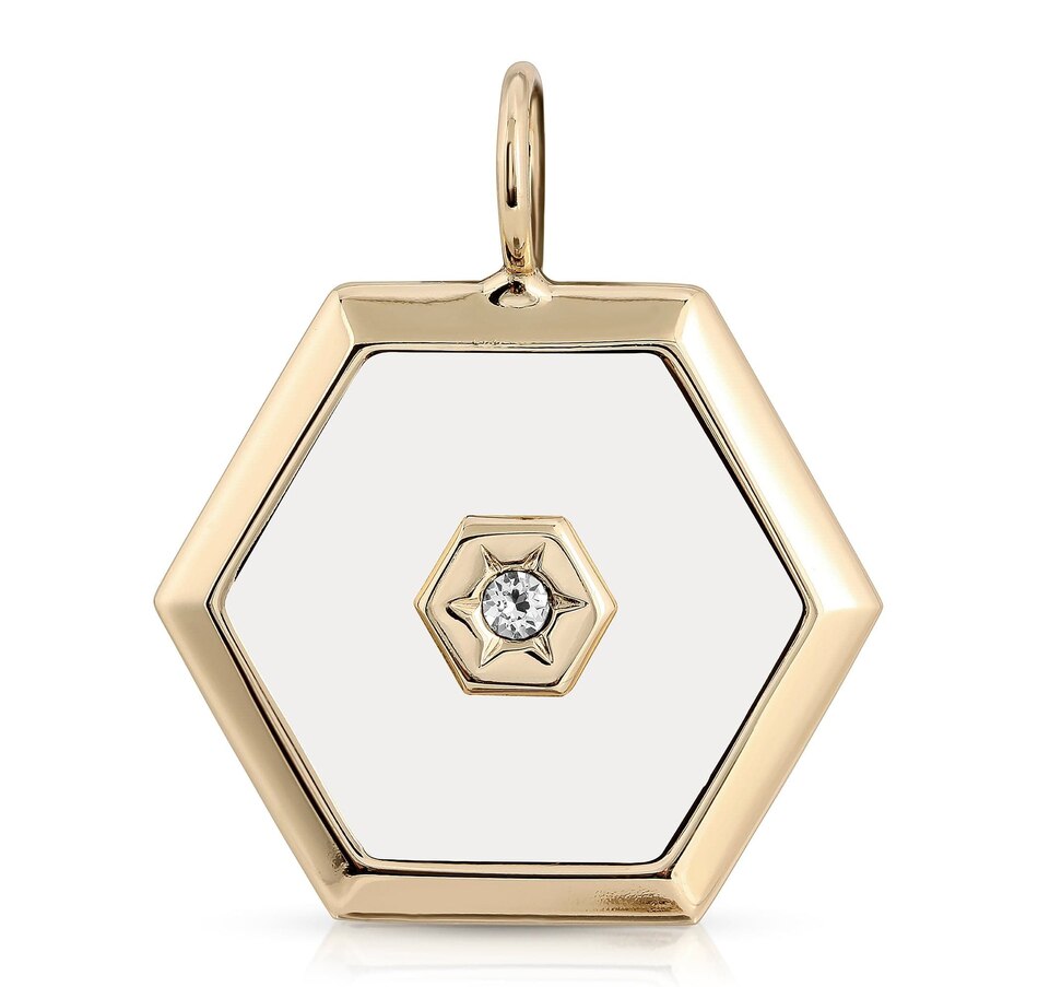 Ashley Pendant is recycled brass plated 14K gold Center of the pendant is filled with white enamelHexagon shaped pendant measures 1.25" long x 1.58" widePendant's center stone is Swarovski CrystalHandmade in the USA
