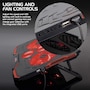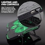 • Lighting and fan controls: adjust speed and LED lighting intensity using the controls on the side; one dial controls the large fans and the other controls the small central fans