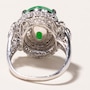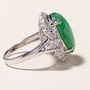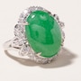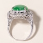 A beautiful, bright, translucent, generously sized green cabochon cut oval-shaped jade is elegantly presented within a sparkling surround of bright white round diamonds, punctuated on each side with a trio of diamond-enhanced ribbons. The stones are set atop an openwork 'basket' with a pierced swirl design supported by split shoulders, rendered in 10K white gold.