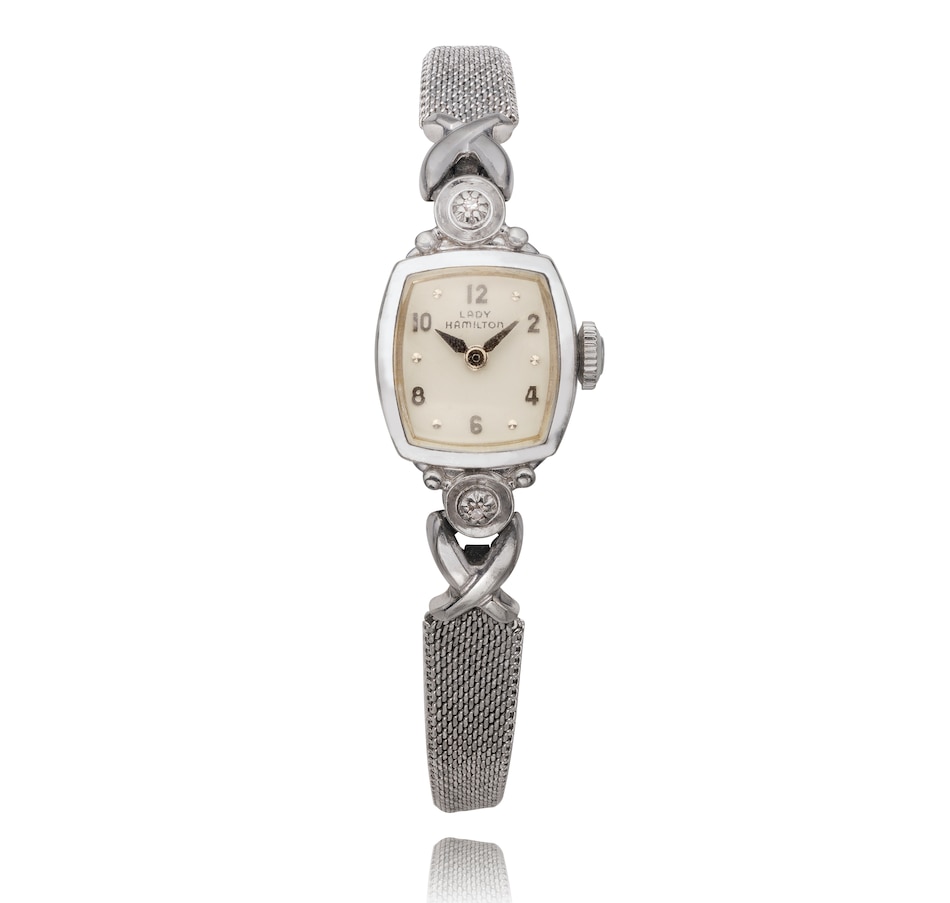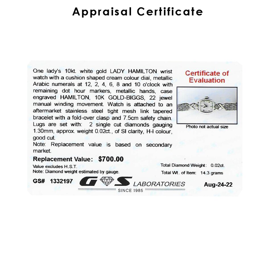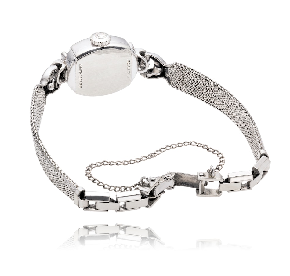 This Lady Hamilton wristwatch is crafted in 10K white gold and has a cushion-shaped cream-coloured dial, with metallic Arabic numerals at the 12, 2, 4, 6, 8 and 10 o'clock hours with remaining dot hour markers and metallic hands. The case is engraved "HAMILTON, 10K GOLD-BIGGS." It runs on a 22-jewel manual winding movement. The watch is attached to an aftermarket stainless-steel tight mesh link tapered bracelet with a fold-over clasp and 7.5-cm safety chain. The lugs are set with two diamonds, one on each side.