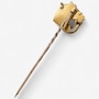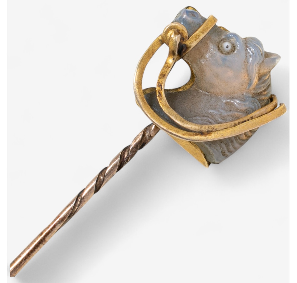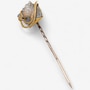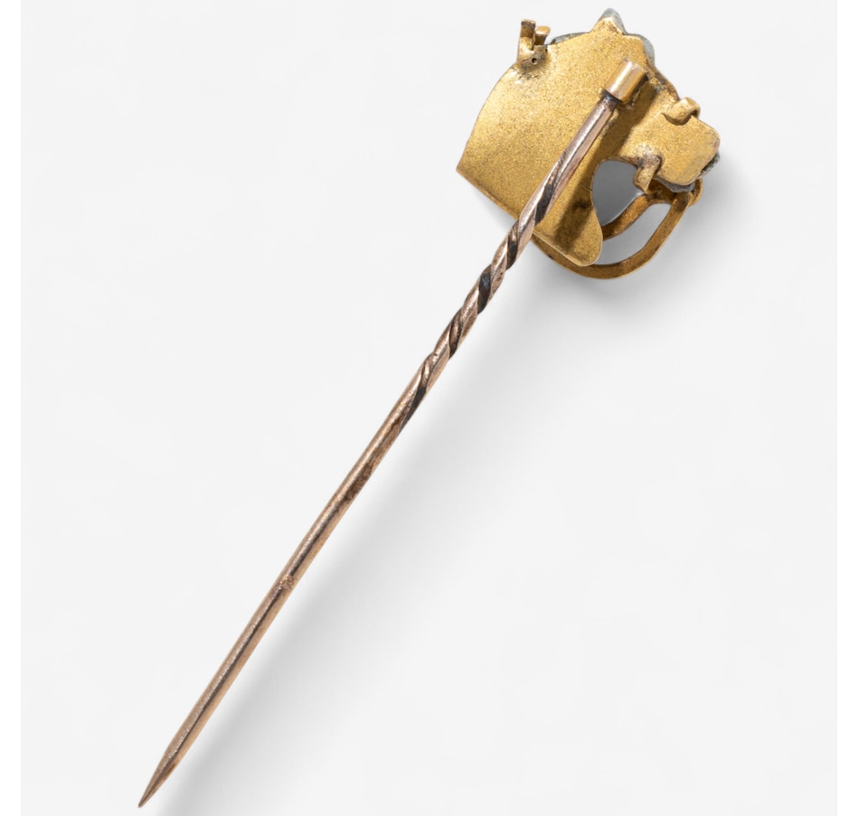 A tie pin (or tiepin, also known as a stick pin/stickpin) is a neckwear-controlling device, originally worn by wealthy English gentlemen to secure the folds of their cravats. They were popular from around 1830 to 1920. The Victorian era saw an explosion of designs, with stick pins adorned with miniature scenes of mourning and crafted in gold. They were particularly popular among sporting men. Cravats were made of silk, satin, lace and lightly starched cambric, lawn cloth, and muslin. Stick Pins were necessary accoutrements to keep these expensive fabrics in place and safe.