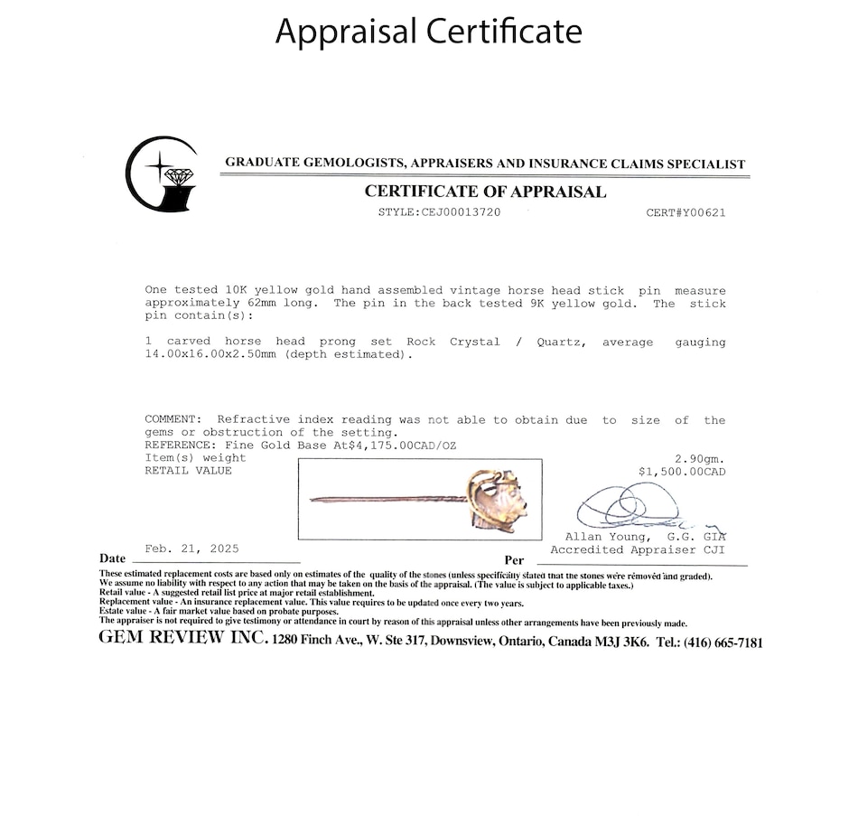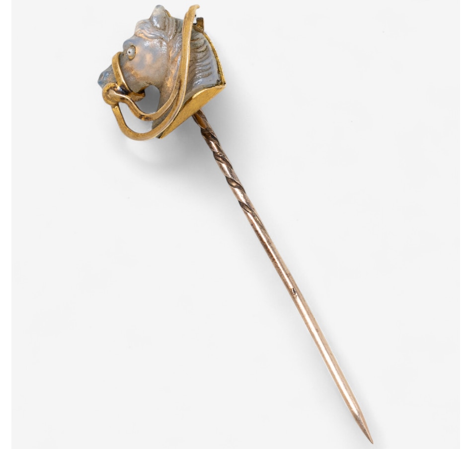 10K Yellow Gold Carved Rock Crystal Horse Head Stick Pin