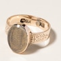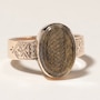 Sentimental and creative, Victorians found beautiful and unusual ways to keep the memory of loved ones in a tangible form, and this remarkable mourning ring is a fine representation. In this quite precious jewel of remembrance, locks of exquisitely woven blonde hair are encased within an oval bevelled glass compartment. A 10K yellow gold mounting with finely hand-engraved shoulders support the piece in low profile.