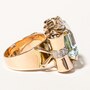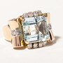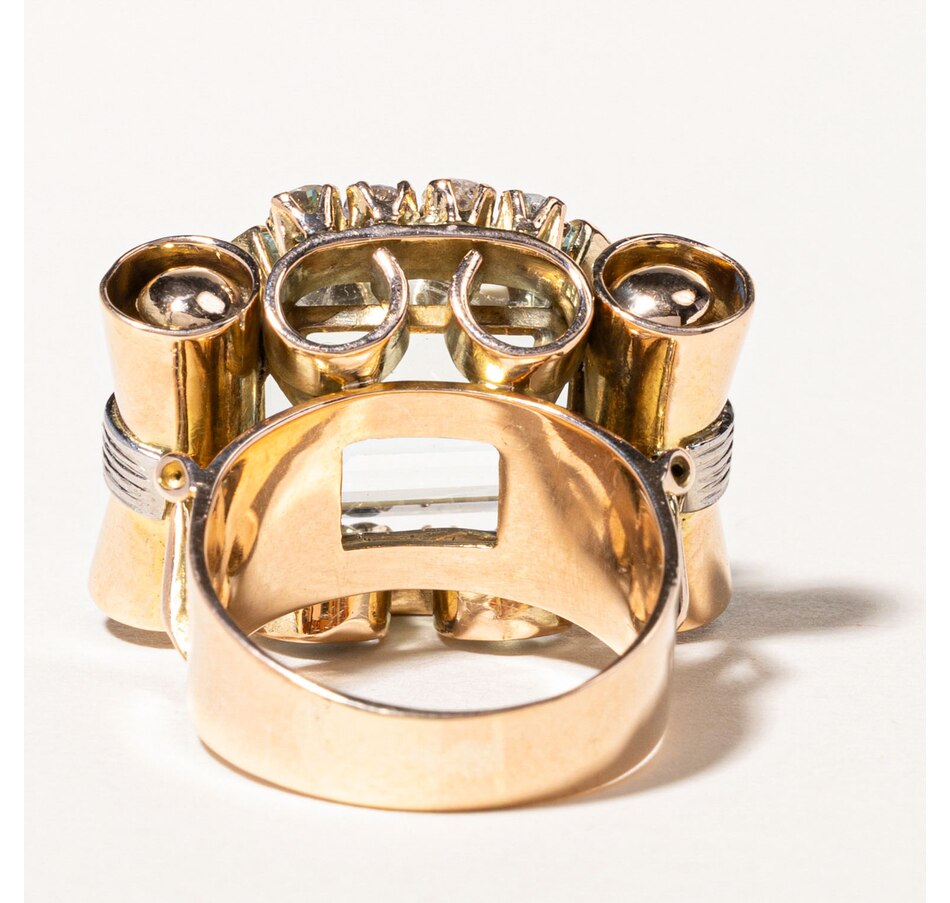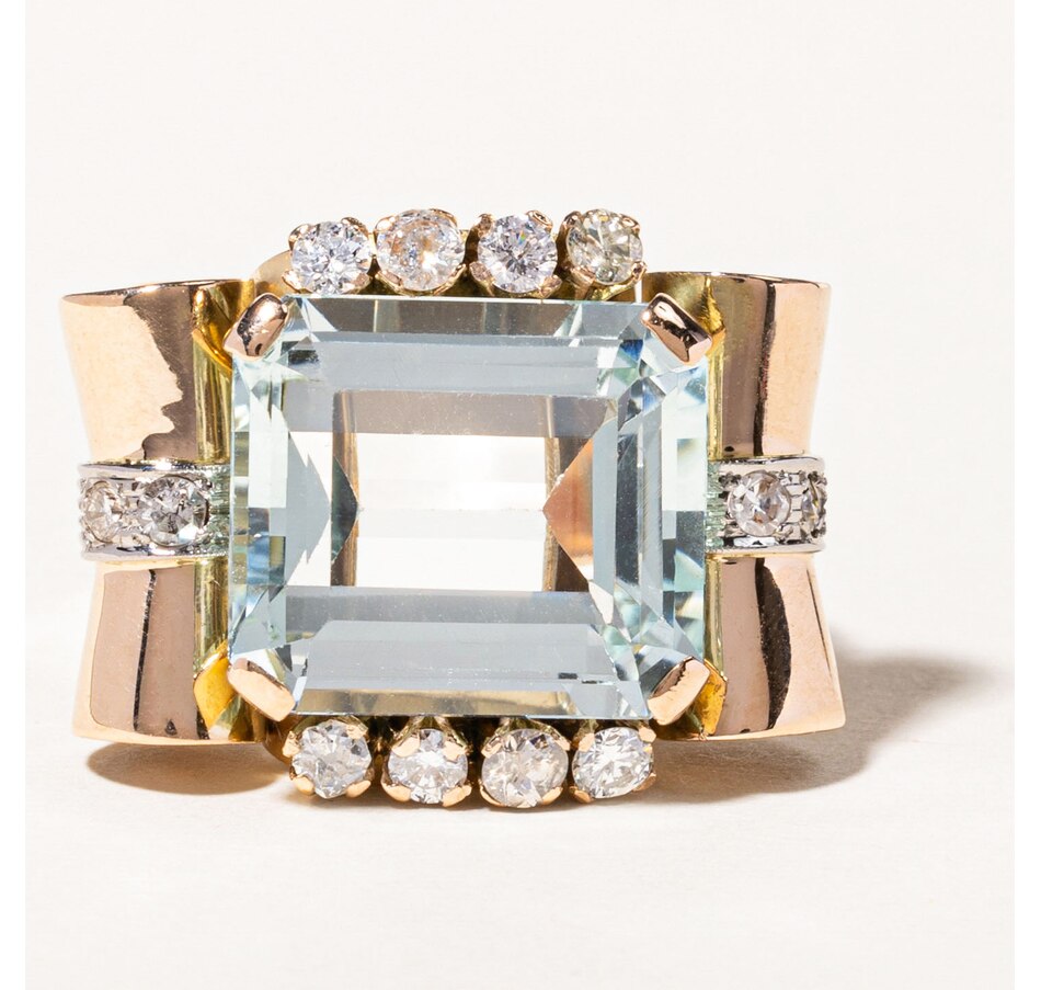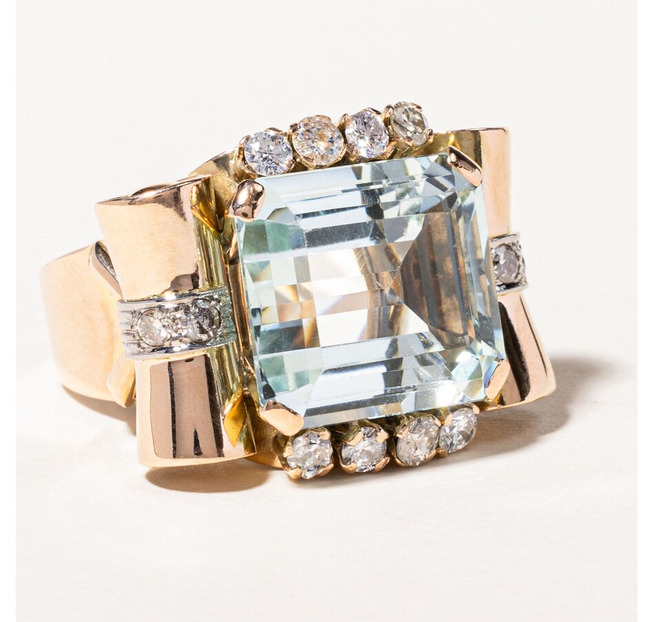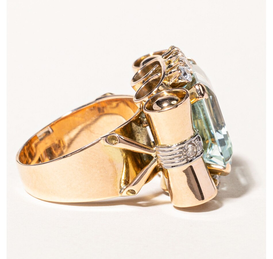 This is an incredibly striking retro ring, circa 1940s. It features a gleaming 13.07-carat emerald-cut aquamarine, turned horizontal, shining solo and casting a lovely sky-blue glow between pinched bow motif shoulders, each cinched with a white gold ribbed ribbon set with two diamonds. Circular button stoppers plug the ends of the bow-like tubes. Two round, brilliant-cut diamonds and two old European-cut diamonds, each prong-set, line the top and bottom of the aqua and are supported by a scroll motif bridge. A "V"-tipped accent rises above the tapered ring shank, supporting the shoulders. This is a show-stopping bauble artfully hand-assembled in 10K yellow gold.