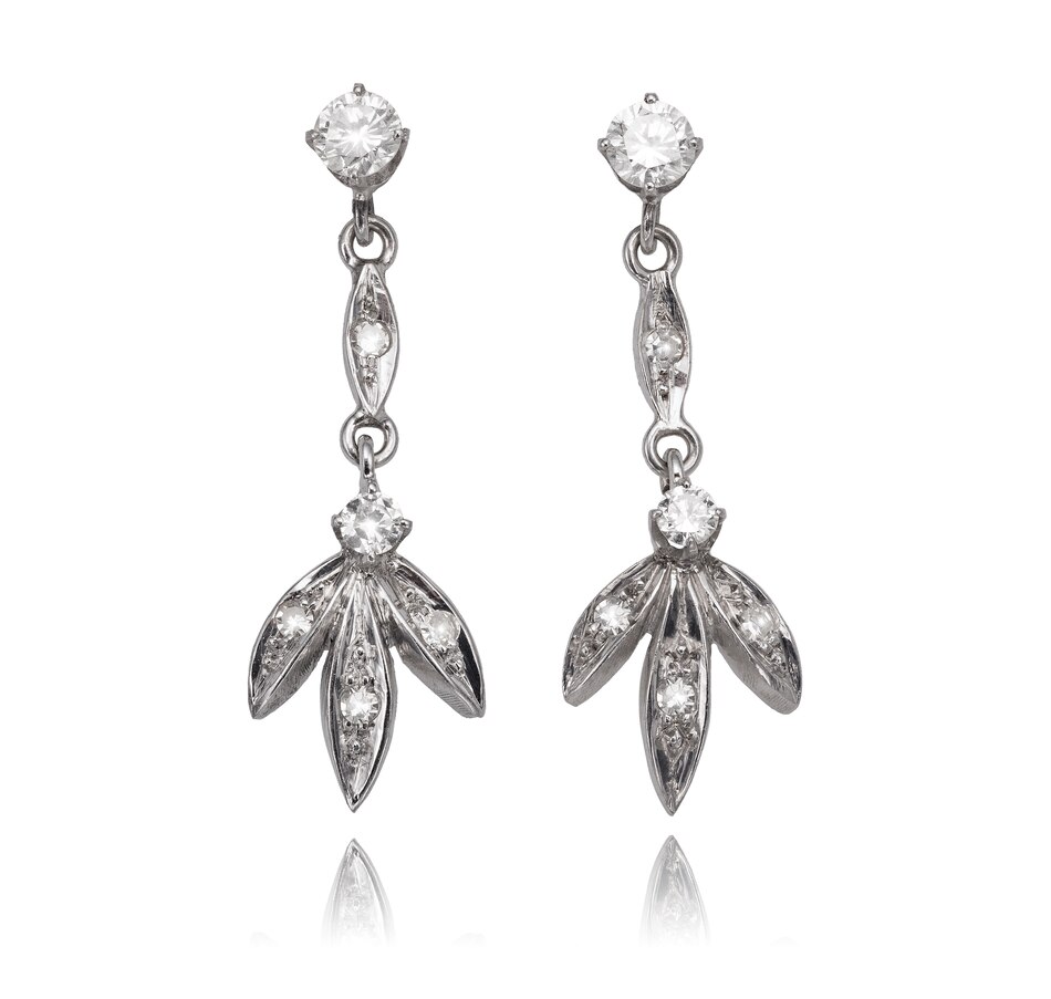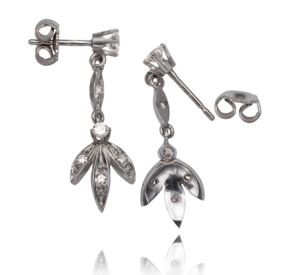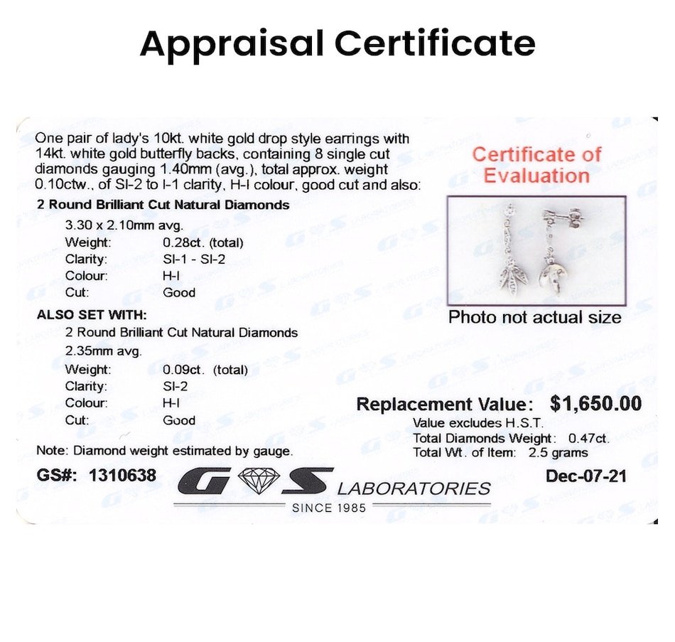• Specs: (2) round brilliant cut diamonds (.28ct), (2) round brilliant cut diamonds (.09ct), (8) round shaped diamonds (.10ct), .47ctw