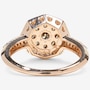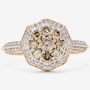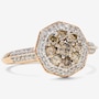 Strikingly modern with a romantic vintage flair, this 14K rose gold halo ring showcases a rare blend of geometry, colour contrast, and intricate craftsmanship. At its centre lies a 0.16 ctw round, brilliant-cut champagne diamond, held securely in place by eight fine prongs, and surrounded by eight additional round, brilliant-cut champagne diamonds, creating a warm, radiant cluster of nine stones. This rich central arrangement is elegantly contrasted by a hexagon-shaped halo of 32 white round, brilliant-cut diamonds, meticulously set to frame the champagne diamonds with brilliance and definition. The sharp geometry of the hexagonal halo plays beautifully against the soft rose gold tones and the gentle warmth of the champagne stones. Beneath the setting, a thoughtfully crafted pierced undergallery features a repeating heart motif, adding a romantic, almost hidden layer of charm and detail. Flowing down from the halo, the knife-edge band is accented with twelve additional round, brilliant-cut white diamonds, angled with six on each side. These eight diamonds per side allow for continuous sparkle from finger to finger.