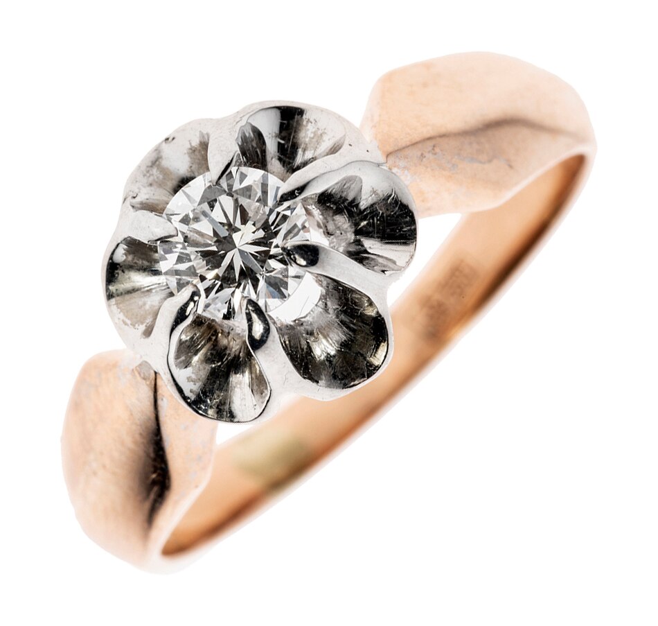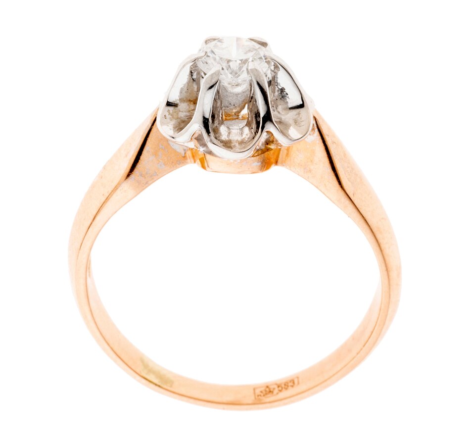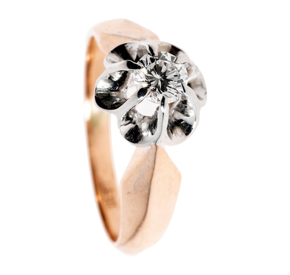 This dreamy vintage solitaire ring would make a fabulous engagement ring for any lover of antique styling; it is crafted with a super high-polished band of 14K rose gold of the most delicious hue, set with a belcher-setting of 14kt white gold. Within the 6 prongs, a spectacular, excellent-quality natural 0.79 carat diamond solitaire flashes and shimmers like a dream. The fantastic clarity, colour and cut contribute to the timeless presence of this vintage ring.