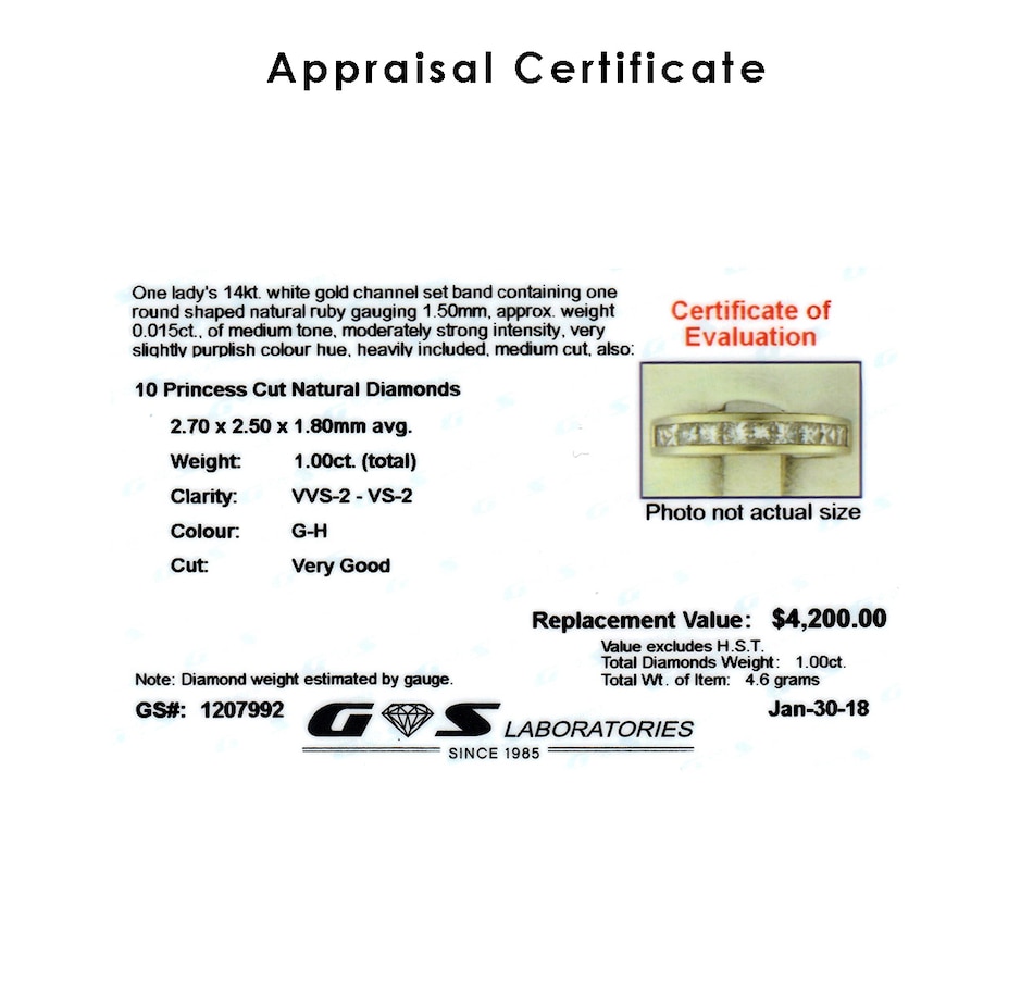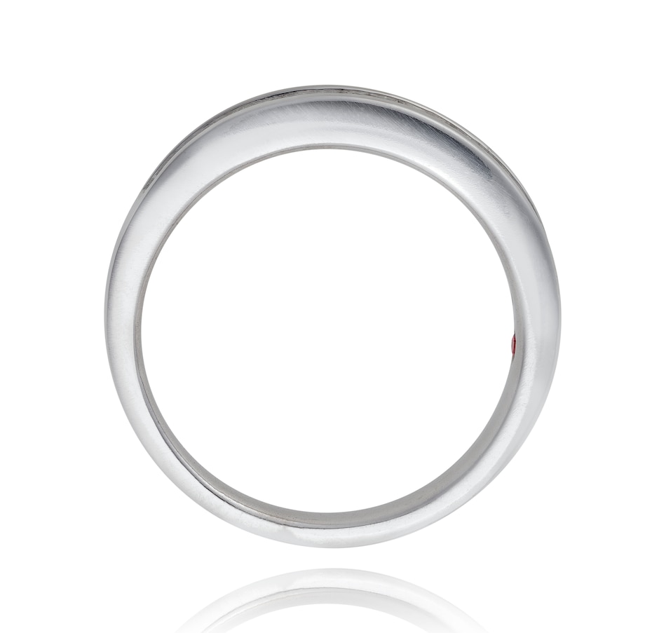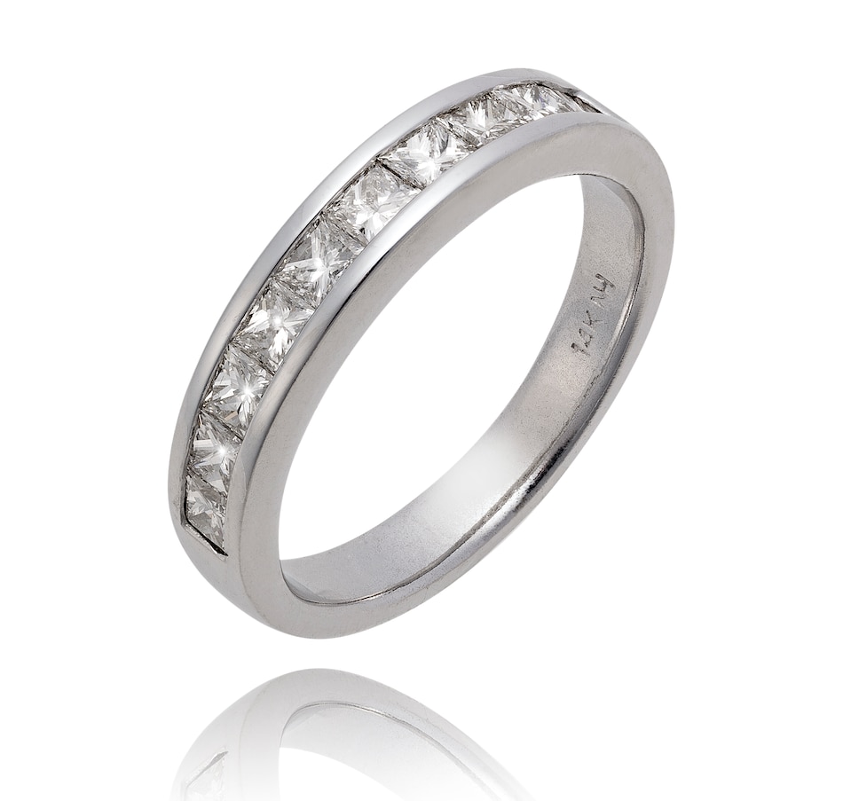 This exceptional quality half eternity band is crafted in beautiful white gold and contains ten princess cut diamonds, channel-set from finger to finger. Hidden inside the ring is a small round shaped bezel set ruby.