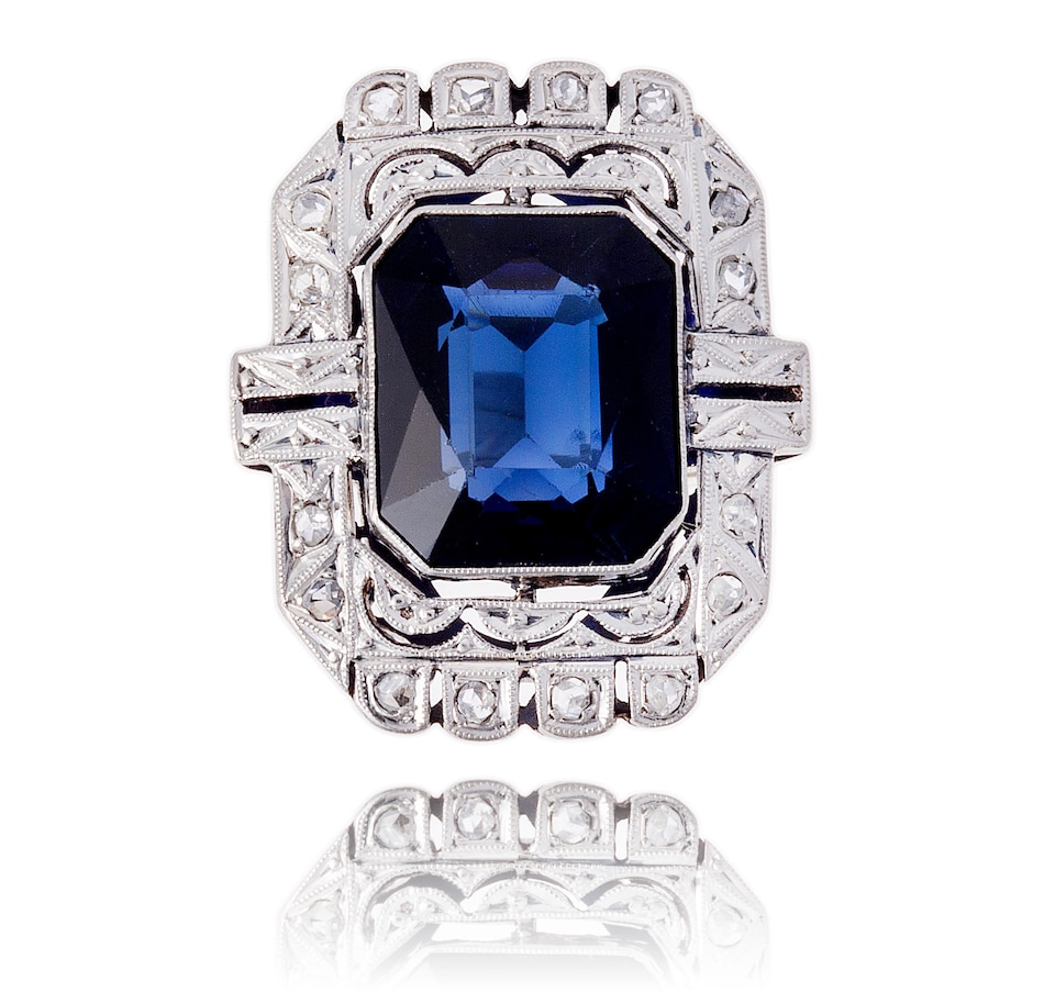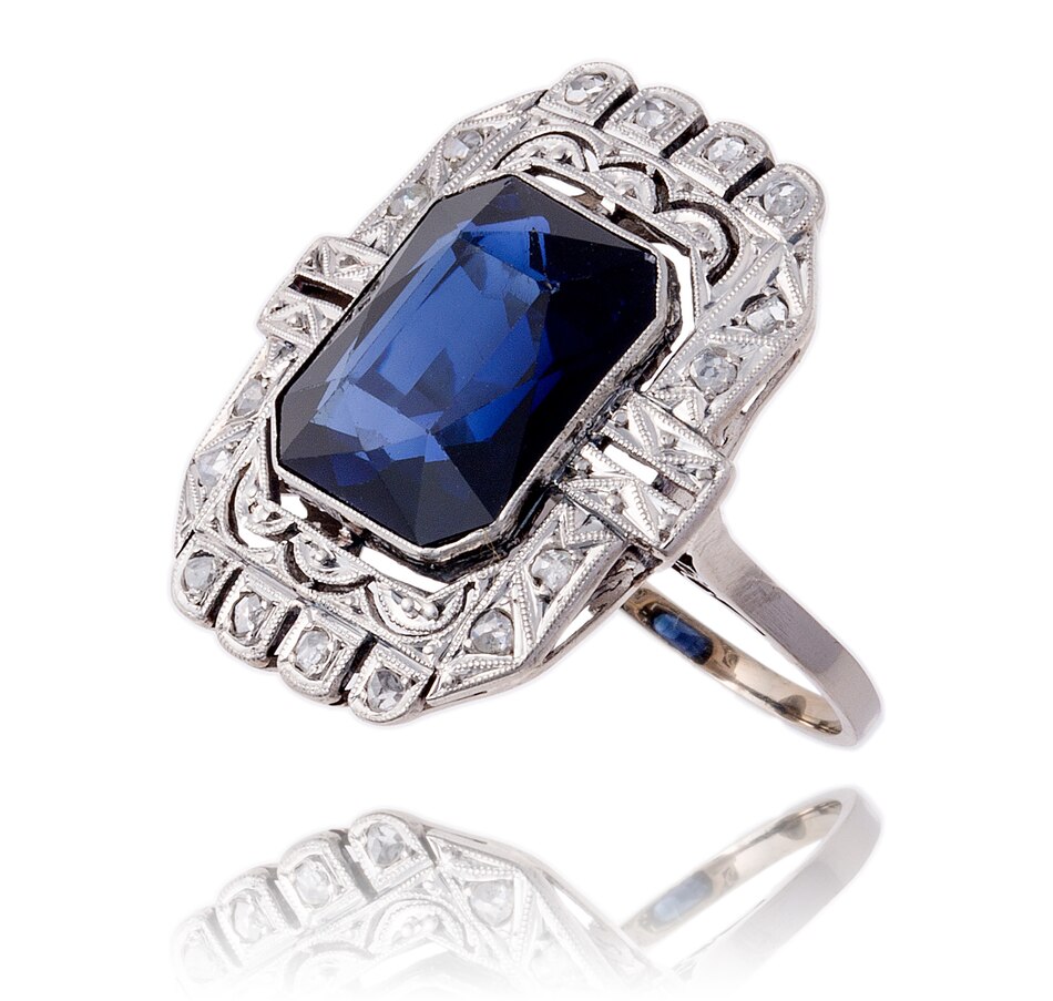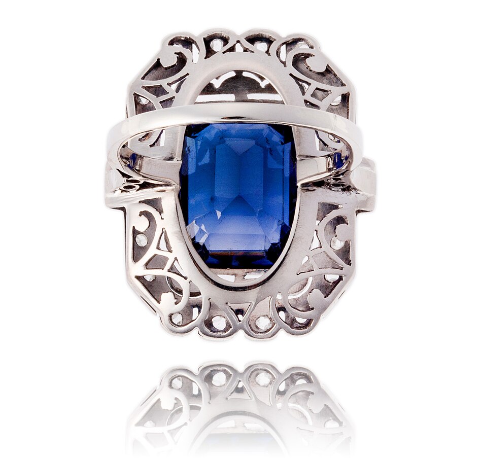 This stunning Art Deco designed ring, rendered in 14K white gold, was crafted between the years of 1915 and 1935. It features a rich royal blue 10.29 carat octagonal cut lab grown blue sapphire at its centre. The stone radiates from within a bezel set cushion shaped frame, accentuated with delicate milgraining, and appears to be floating as it is surrounded by negative space. An intricate pierced scallop design creates a rectangular presentation that is topped with four individual square motifs, each set with an old European cut diamond, on the top and bottom. The corners are cropped and the sides are set with an additional four old European cut diamonds on each side, further divided two and two by an engraved and pierced bar that spans east/west from the middle. Delicate details and milgrain edging combined with the geometric design are strong indications of the Art Deco period. The undercarriage has been hand pierced into an elegant scrolled pattern, allowing light to reach the underside of the stones for maximum sparkle. The sixteen sparkling old European cuts combine to total 0.22 carats.