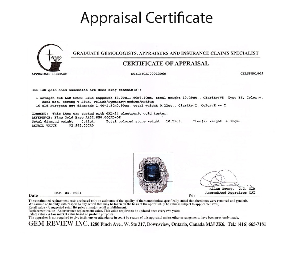 • Total synthetic sapphire weight: 10.29 carats: (1) octagonal cut lab grown