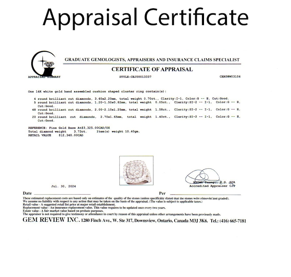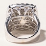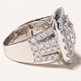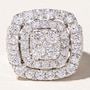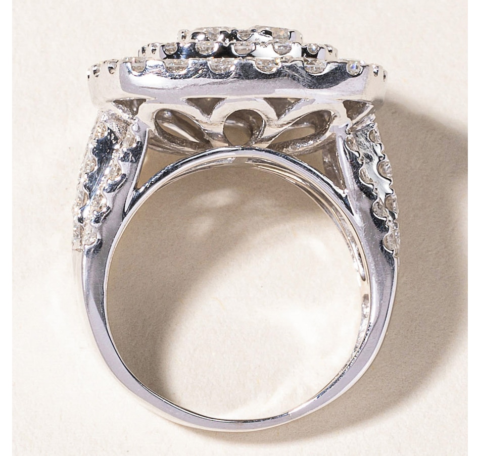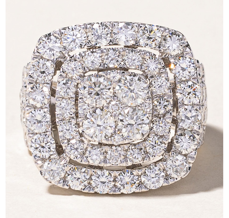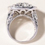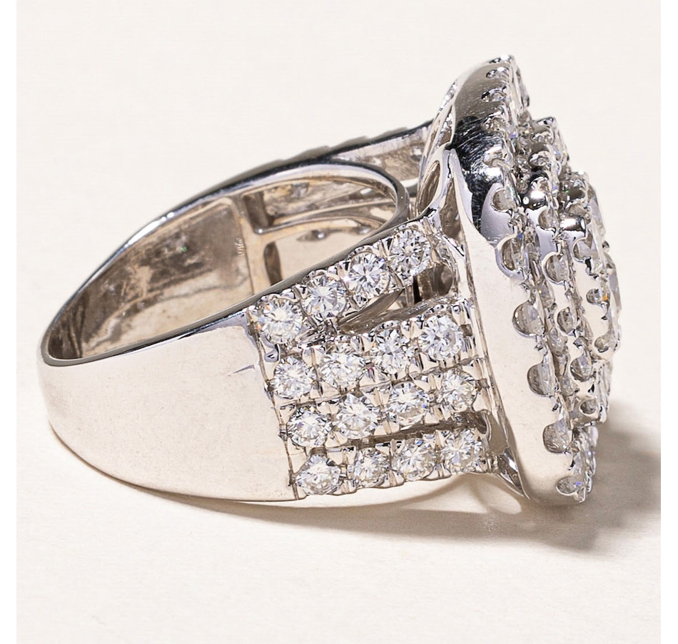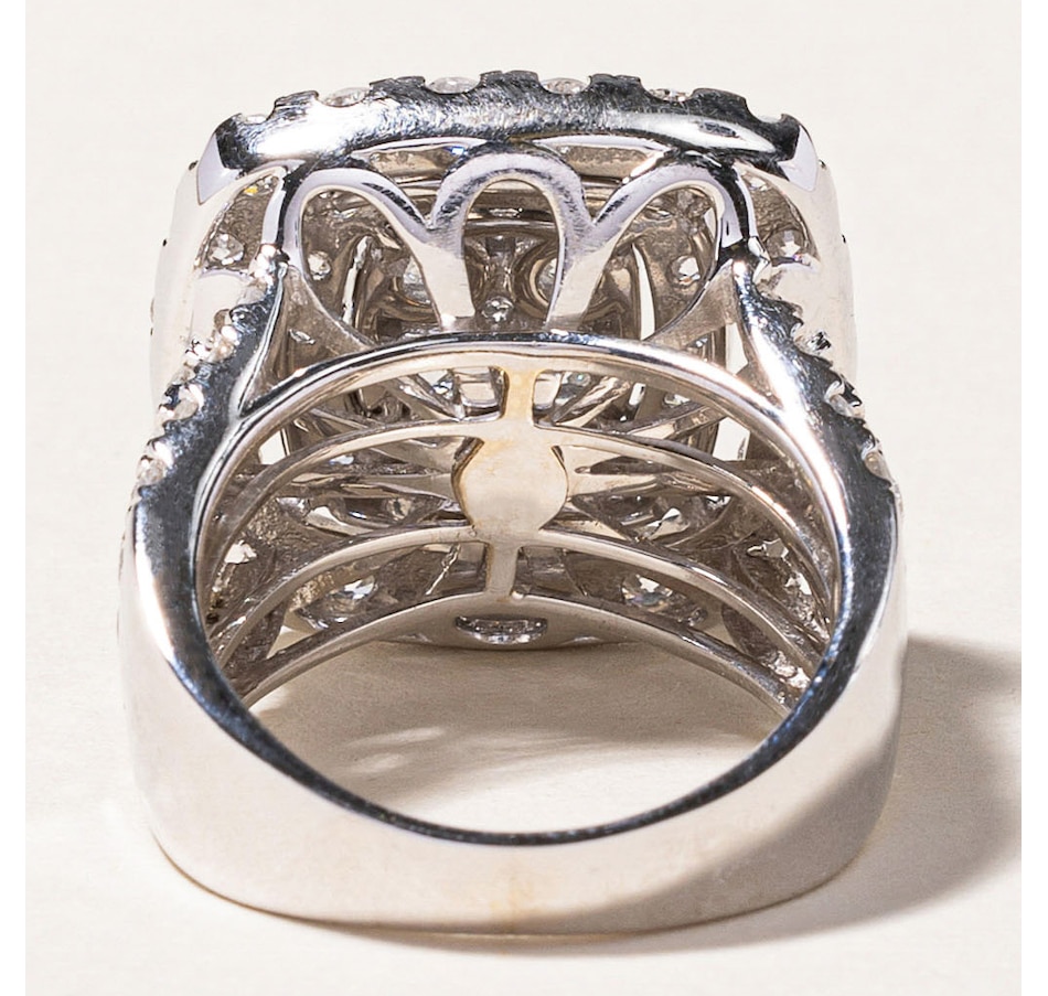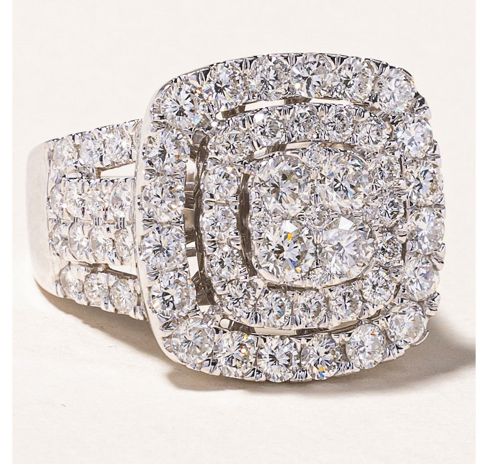 At the centre of this ring, four larger diamonds (0.17 ctw each) and five smaller diamonds (0.05 ctw each) create the perfect cushion shape and appear, at first glance, as one large stone. This centre is double-framed by bevelled octagonal halos that shimmer with bright white modern round brilliant-cut diamonds, the first containing 16 diamonds and the second sporting 20. The shoulders are each prong-set with an additional 16 diamonds, split into two lower and two upper rows of four diamonds each. An undergallery with an openwork petal-like motif adds the finishing detail to this classic piece. The ring is rendered in 14K white gold and has a total diamond weight of 3.73 carats.