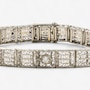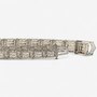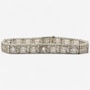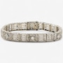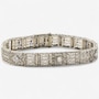 Exquisitely crafted in beautiful white gold, this 7.25" long bracelet is a stunning example of early 20th-century elegance, echoing the refined artistry of the Edwardian to Art Deco era (circa 1910s–1930s). The bracelet features intricately pierced, hinged square links, each adorned with a delicate floral and foliate filigree motifs—a hallmark of the period’s passion for lacy, airy designs in precious metals.
