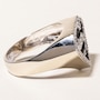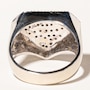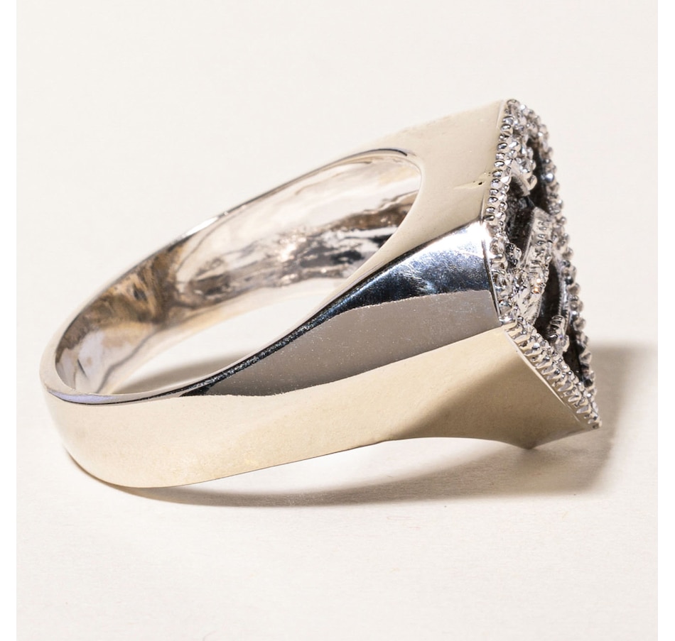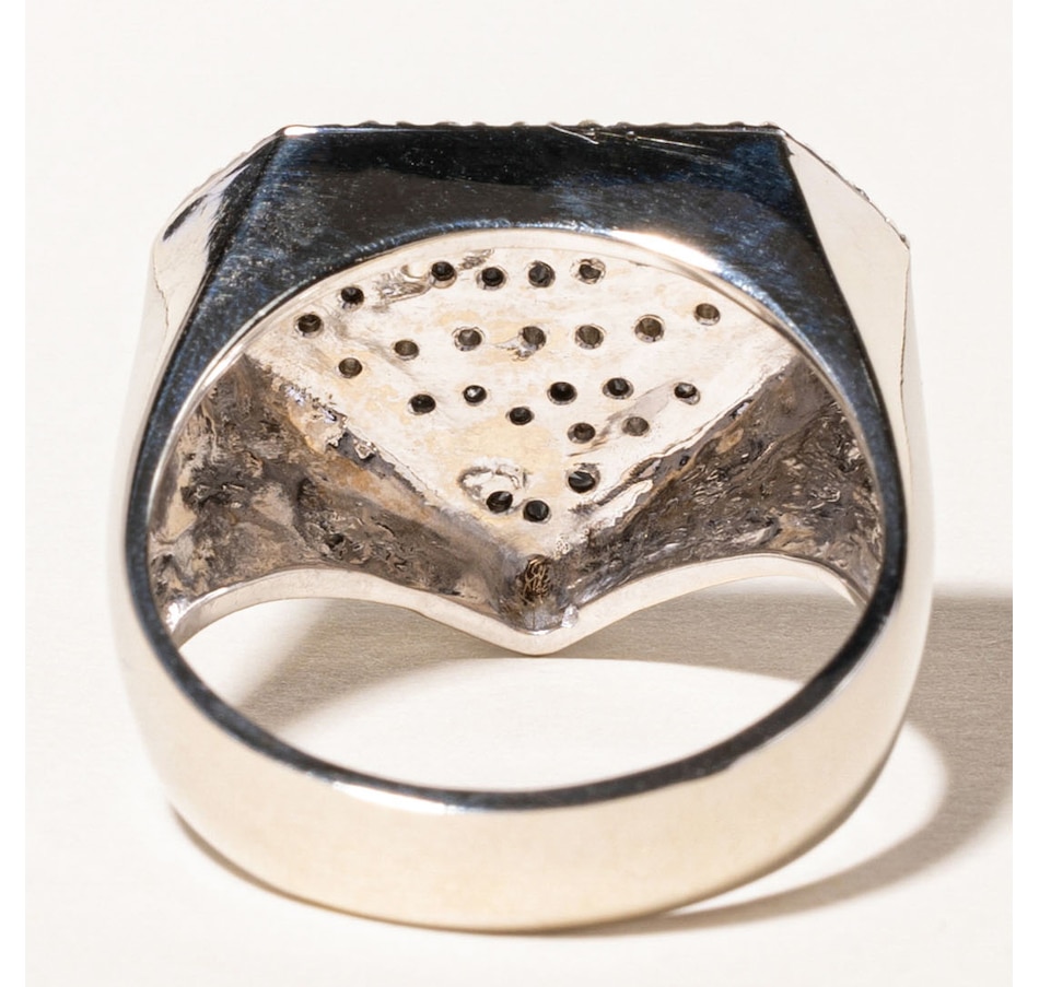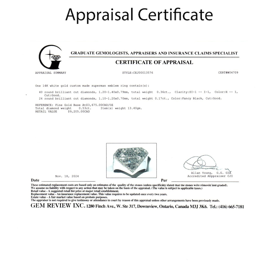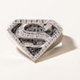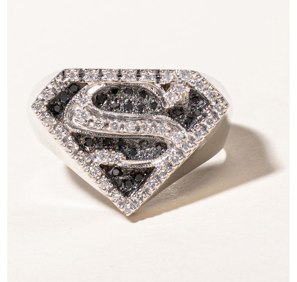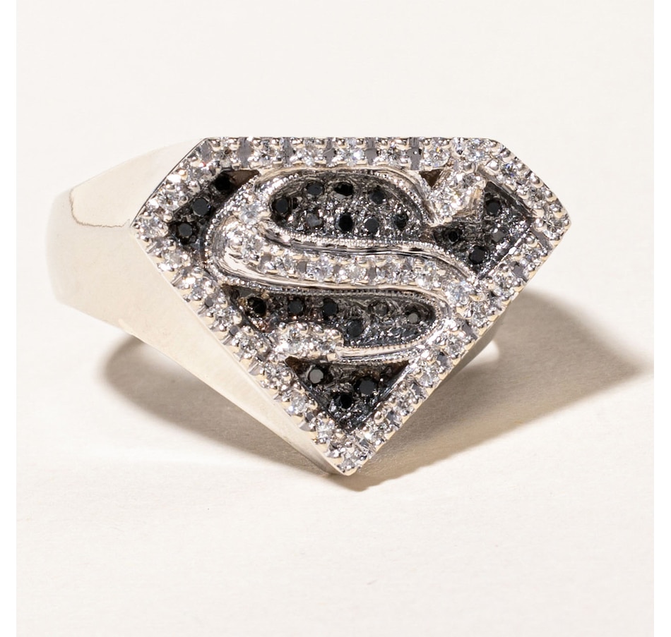 This stunning 14K white gold Superman logo ring is a bold statement piece for fans of the iconic superhero. Expertly crafted, the ring features the unmistakable raised "S" emblem and shield brought to life with 40 dazzling white round, brilliant-cut diamonds that sparkle magnificently against the polished white gold. An additional 24 black-coloured diamonds fill the recessed background. The intricate detailing of the logo is accentuated by the contrast between the shimmering diamonds and the sleek angular high polished metallic finish of the shank. Perfect for anyone seeking a unique combination of luxury and fandom, this ring is both elegant and empowering. The 64 diamonds combine for 0.53 carats.