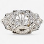 This magnificent Jazz Age beauty cleverly combines an array of geometric shapes in a unique and intriguing assemblage. At its centre, a wreath-like braided circular motif orbited by four diamonds per side and a diamond-cut geometrically engraved bottom encircles a pierced stylized crown emblem with two bezel-set diamonds. The circle appears to be mounted upon a fancy rectangle, revealing only the open corners from the top perspective, and a triple circle bridge from the undergallery. Stylized chevron-shaped shoulders, each set with three diamonds, create a captivating regal frame and two small triangles peek out from between the circular centre and the chevron shoulders on each side. Milgrain edging adds the final design details. This captivating and curvaceous original Art Deco jewel, circa the 1920s to the 1930s, is hand-fabricated in 14K white gold.