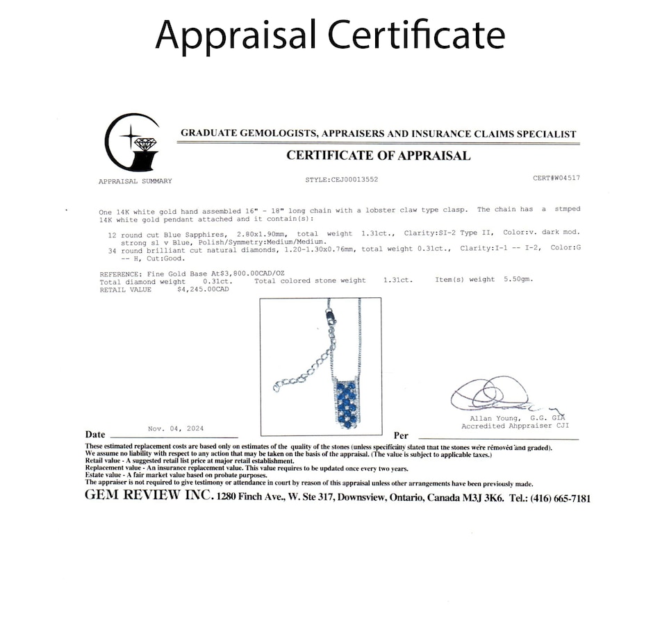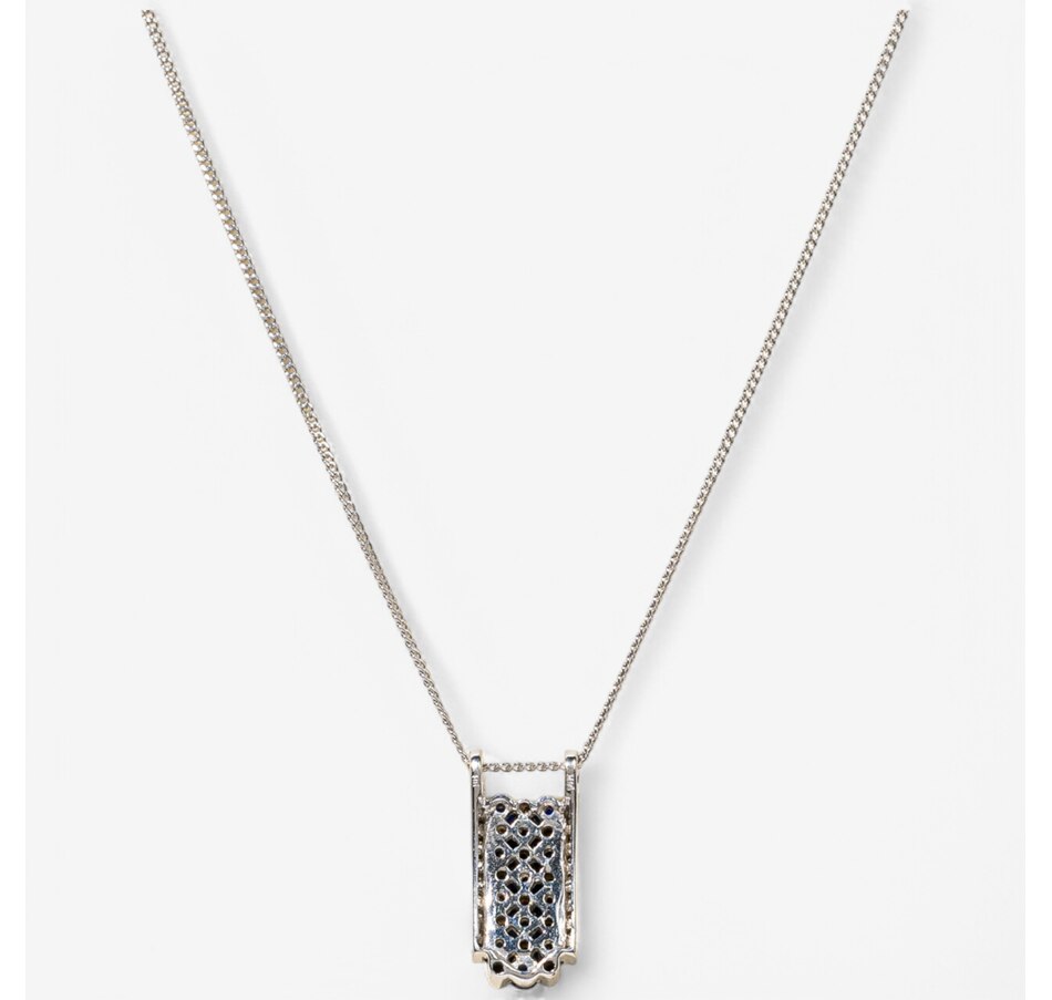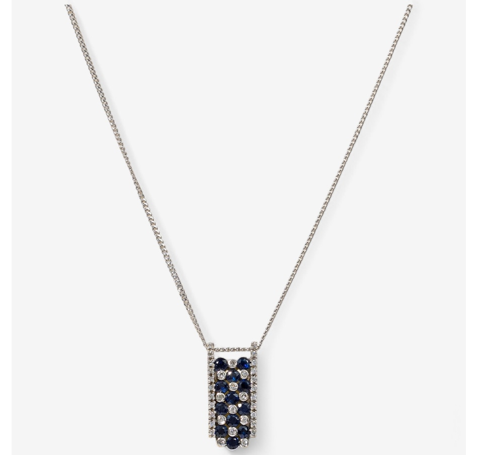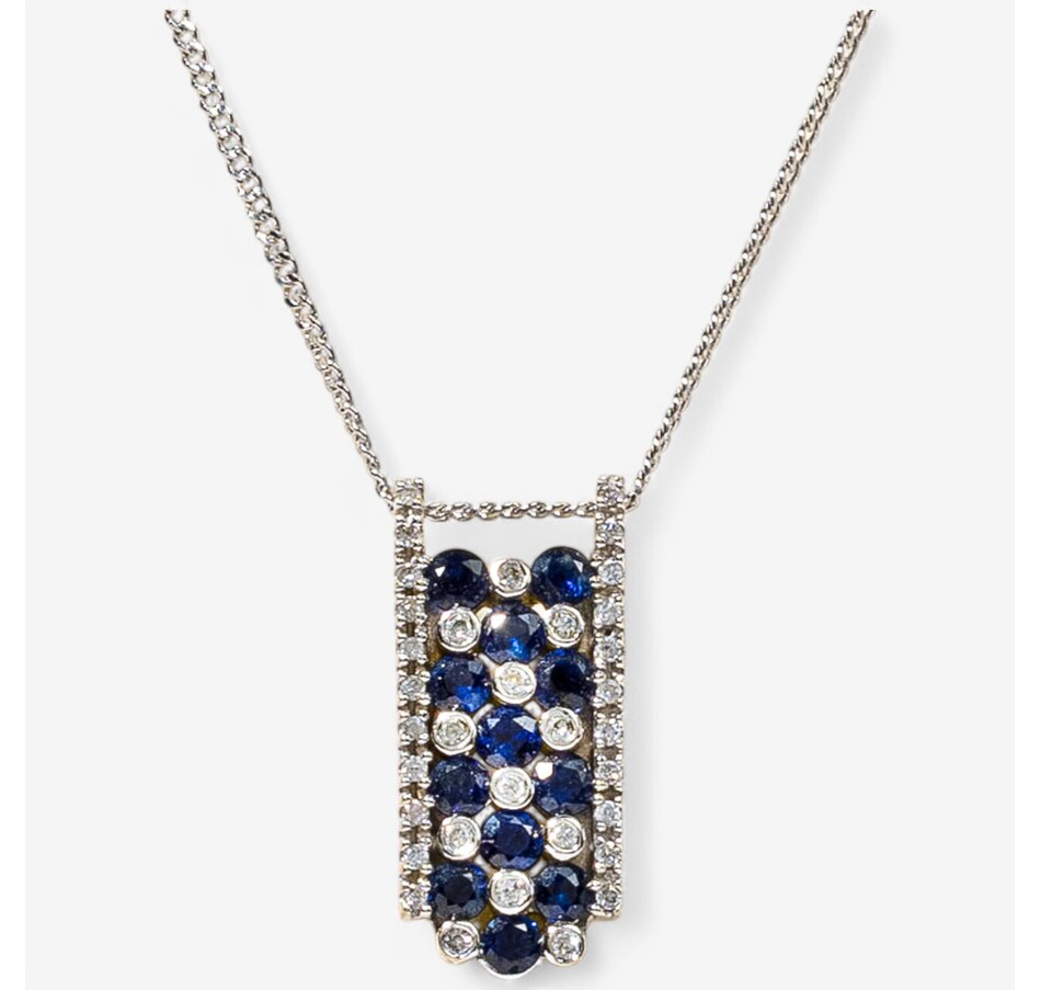 This exquisite slider pendant showcases a captivating checkerboard design, featuring twelve prong-set sapphires arranged in a pattern that creates a bold, vibrant statement. Interspersed between the sapphires are twelve bezel-set round, brilliant-cut diamonds, adding a sophisticated touch of sparkle and enhancing the depth of the design. The pendant is beautifully framed on each side with eleven prong-set diamonds that span from the bottom, continuing past the checkerboard setting in a curved fashion, to facilitate the 14K 16 - 18"" adjustable chain with lobster clasp included.