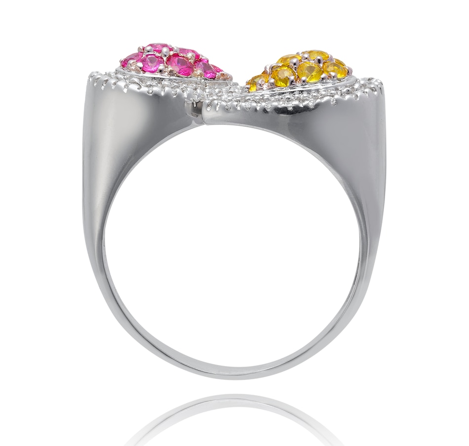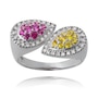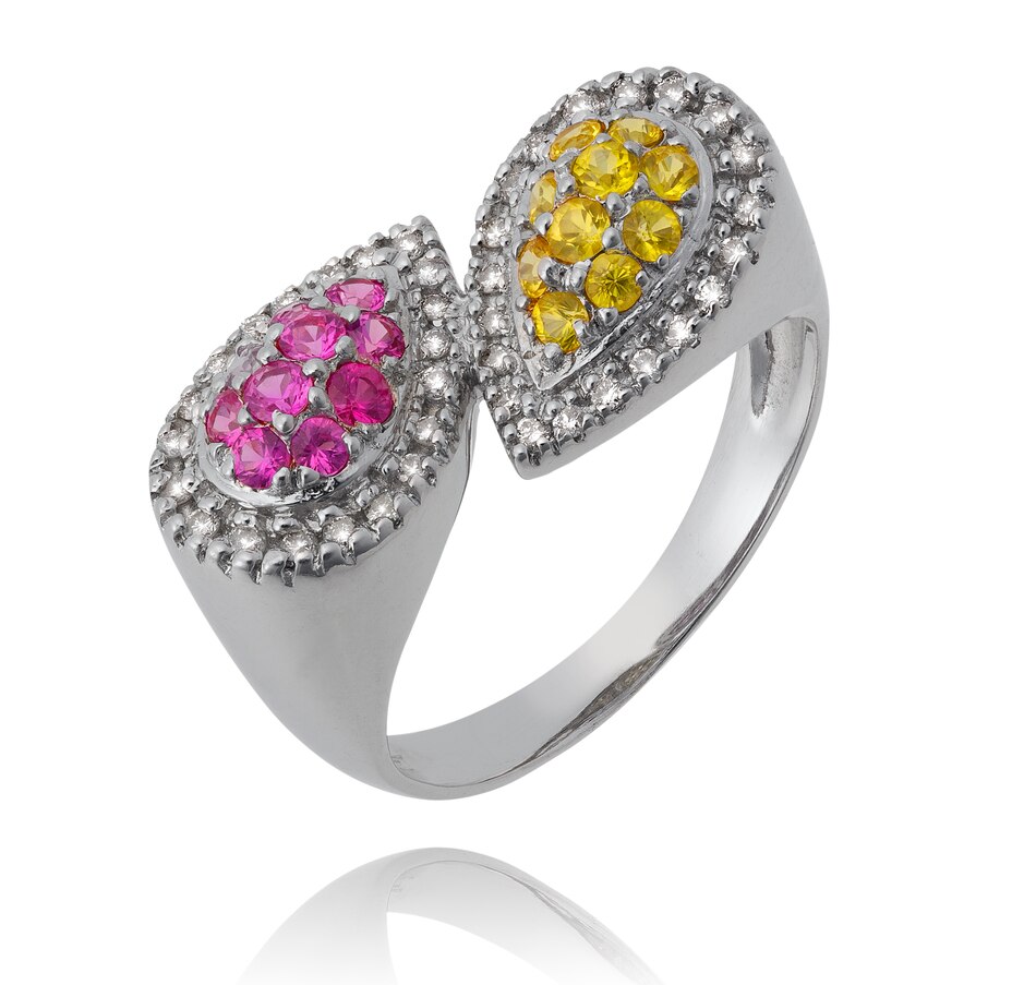 This striking ring is crafted in 14K white gold and features two pear shaped clusters places on a bypass angle while running horizontally across the finger. Each of the clusters are surrounded in a halo fashion by a prong-set row of round brilliant cut diamonds. One pear shape contains ten round shaped synthetic pink sapphires, while the other boasts ten prong-set synthetic yellow sapphires. The forty diamonds combine for 0.20 carats, the yellow sapphires for 0.20 carats, and the pink sapphire 0.20 carats. Its matching earrings are product number 737327.