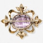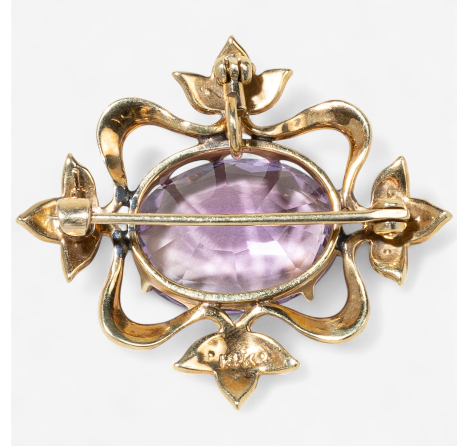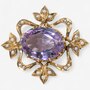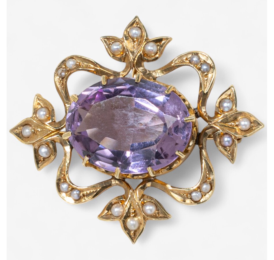 An ornate, openwork designed frame with delicate floral or foliate motifs, each accented with small seed pearls, creates a scalloped frame around an oval shaped amethyst in this arresting Victorian/Edwardian period convertible brooch/pendant (via flip bale). The piece has a symmetrical, almost star-like shape, giving it an elegant and vintage aesthetic. The combination of rich purple amethyst, lustrous pearls and yellow gold setting is indicative of refined jewellery styles of the late 1800's and early 1900's.