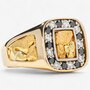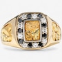 Bold and distinctive, this beautiful gold nugget-style ring is a striking fusion of natural texture, dramatic contrast, and refined design. At the center of the piece is a free-form yellow gold nugget, its organic, raw surface framed and backed in sleek white gold, creating a balanced interplay between rugged and polished elements. Encircling the central nugget is a cushion-shaped halo, set with eighteen alternating white and black diamonds. Each diamond is securely held in white gold prongs, adding visual rhythm and a striking contrast that highlights both the sparkle of the white diamonds and the rich depth of the black.