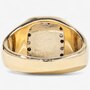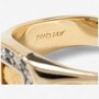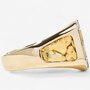 This unique combination of colours and textures gives the ring a powerful presence with a refined edge. The yellow gold band is bordered in high polish for a clean, defined look, while tapered nugget-textured inserts on both shoulders echo the central motif, tying the design together with thoughtful continuity. A bold statement of individuality and style, this ring blends natural gold textures with modern sophistication.