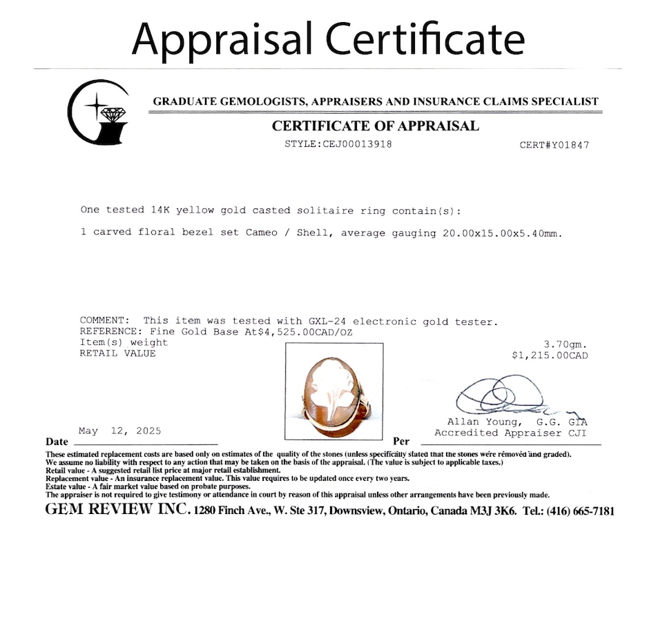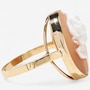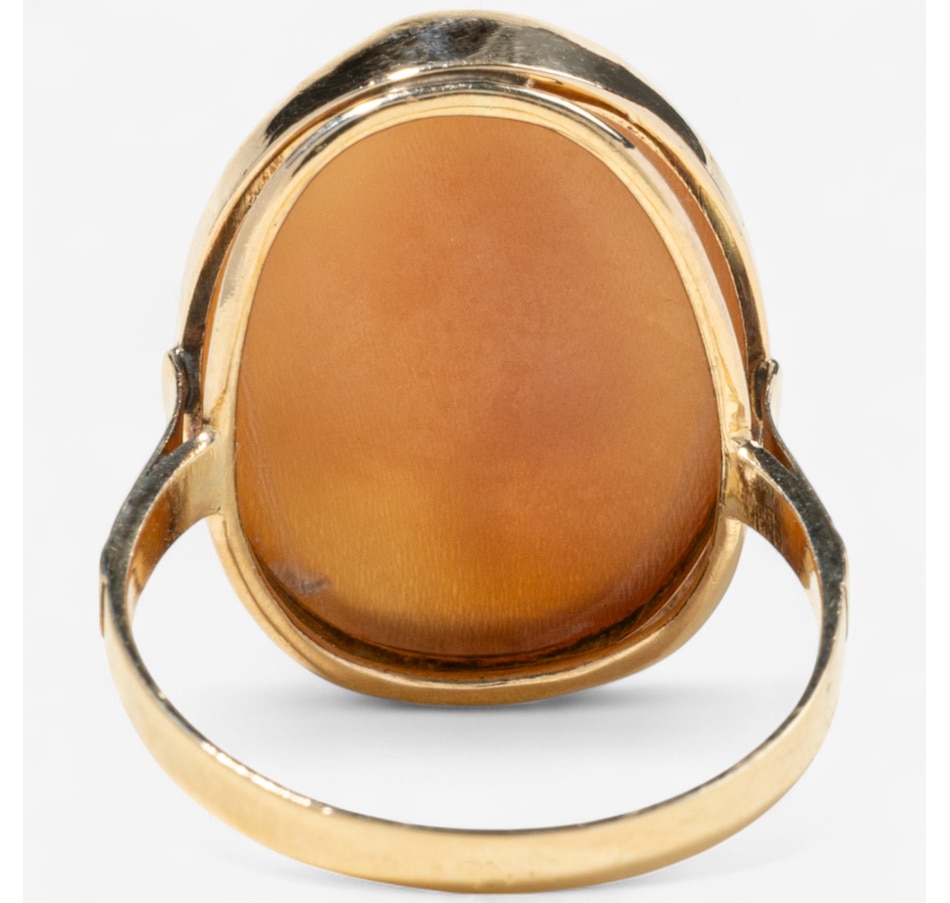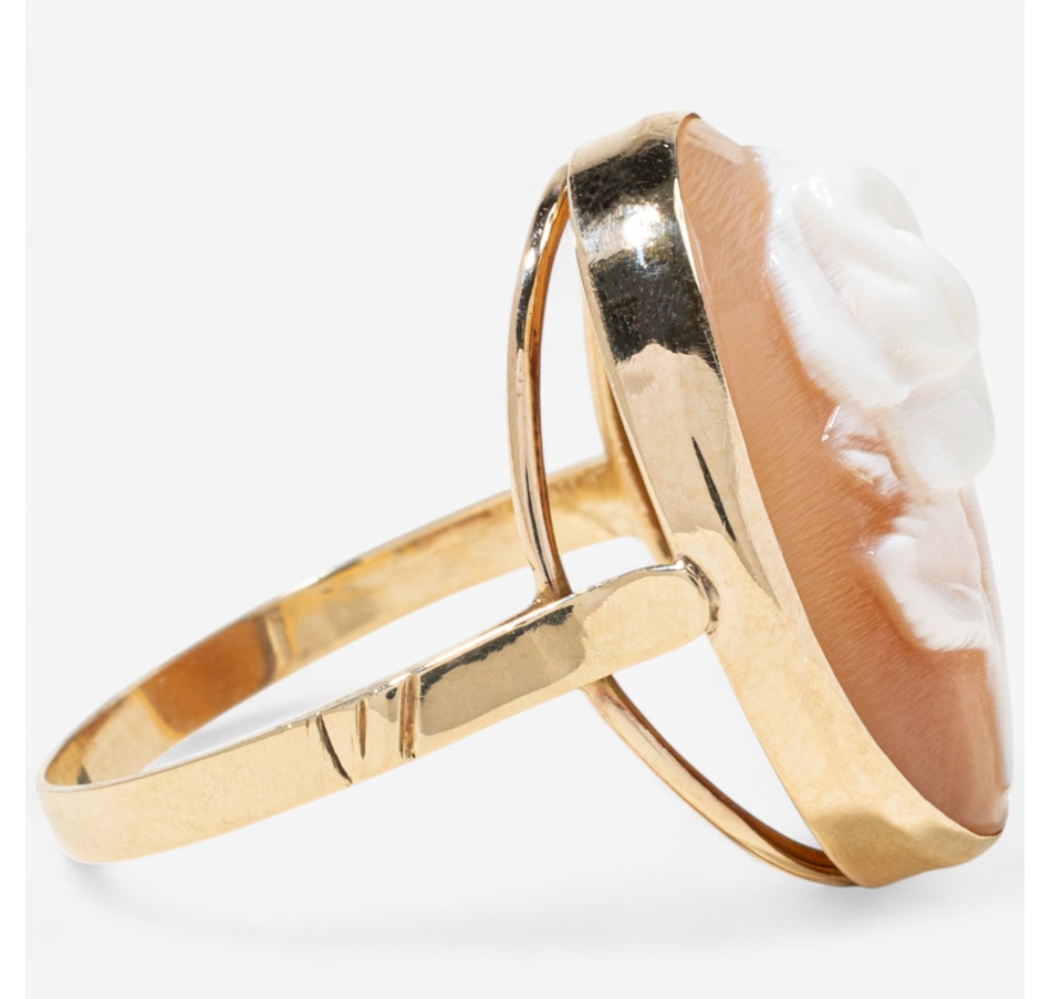 A poetic tribute to nature and the artistry of the past, this 14K yellow gold ring showcases a delicately carved shell cameo, capturing the quiet beauty of a two-flower bouquet. With graceful straight stems, soft leaves, and gently blooming petals, the carving is rendered in serene detail, a testament to the enduring craftsmanship of the cameo tradition. Set into a warm yellow gold frame, the oval cameo exudes a quiet elegance. The soft contrast between the creamy relief and the peachy shell background creates a subtle depth, drawing the eye to the intricate floral composition, a symbol of grace, growth, and remembrance.