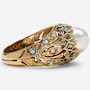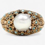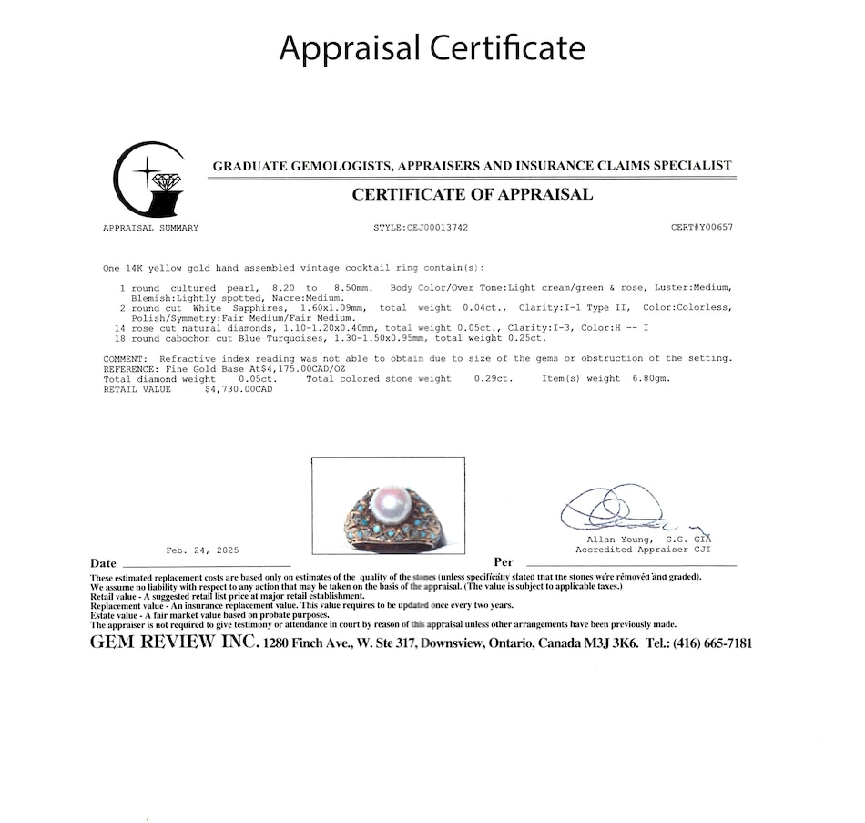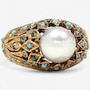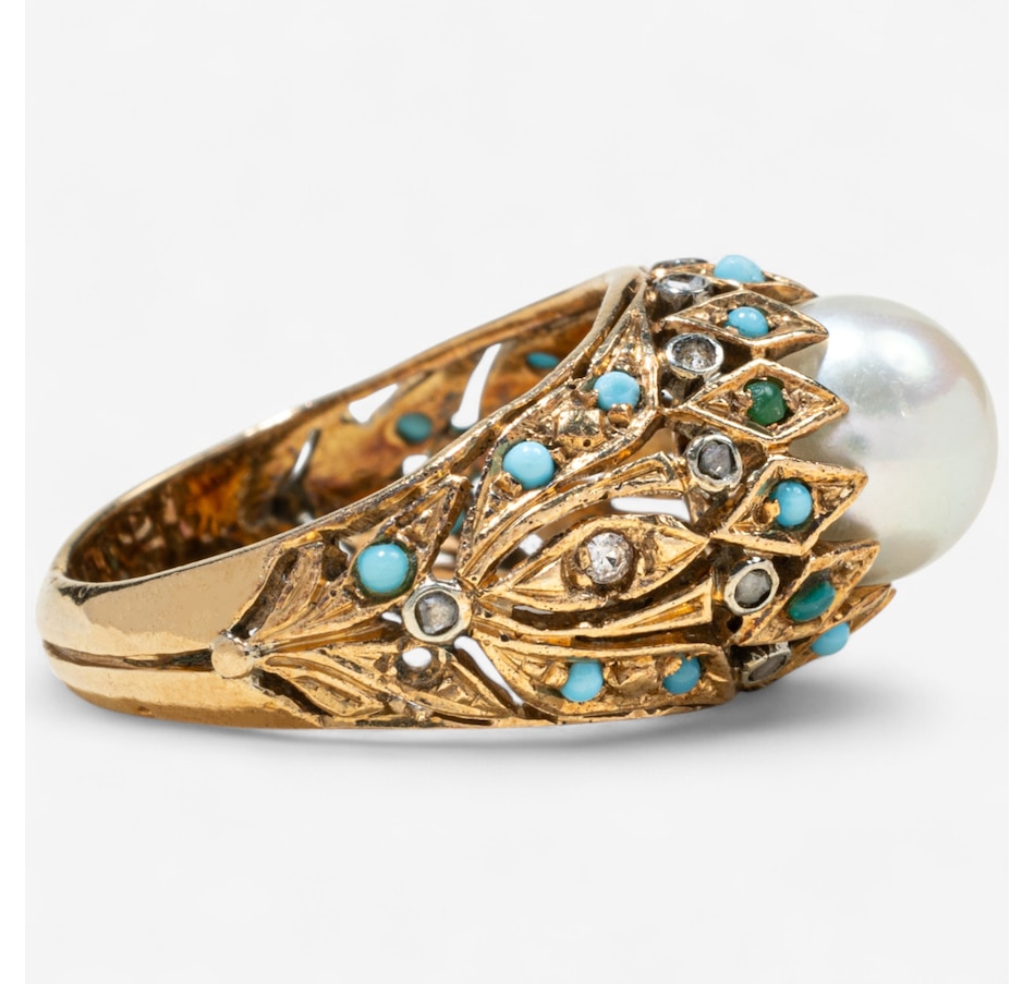 14K Yellow Gold Cultured Pearl Ring with Turquoise and Rose Cut Diamond Embellishments