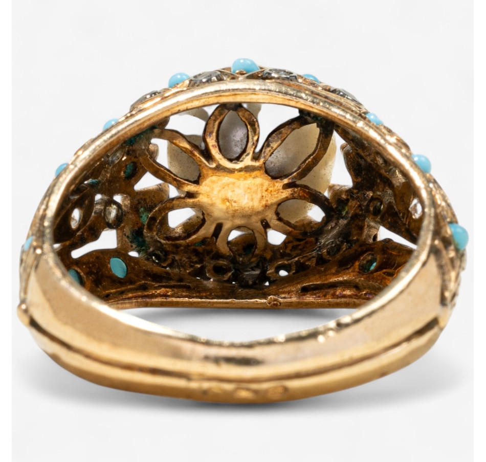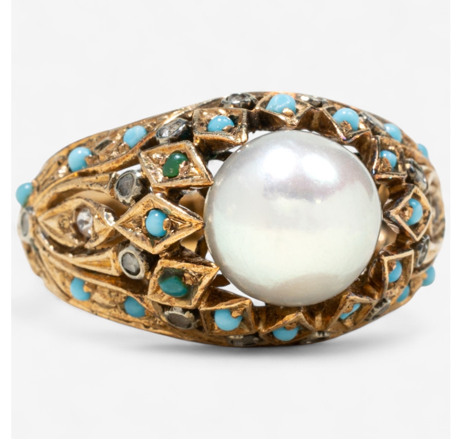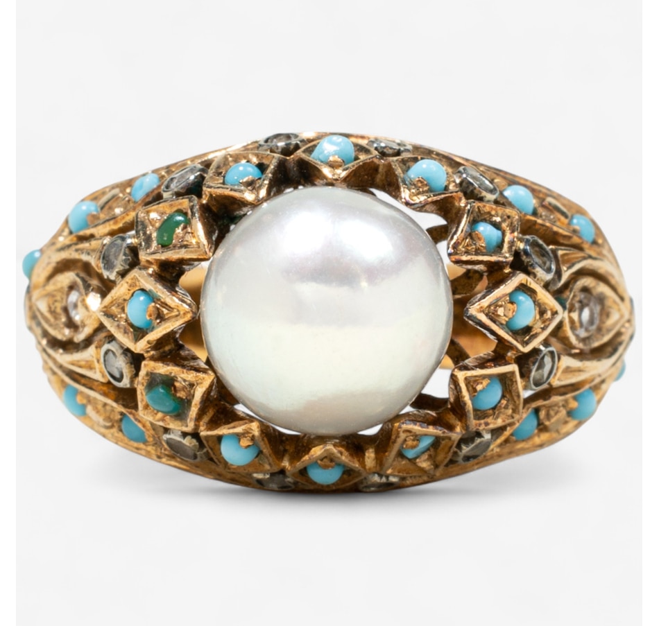 A breathtaking nod to the grandeur of the Victorian era, this beautiful yellow gold ring is a masterful blend of ornate craftsmanship and timeless elegance. At its heart rests a luminous cultured pearl, its soft, creamy luster beautifully framed by an intricate halo of design. The domed band is adorned with a repeating pattern of gold diamond shapes, each set with a delicate turquoise cabochon, their points forming an open star motif that gracefully encircles the central pearl. Nestled between and beneath these diamond shapes are bezel-set rose cut diamonds, adding a subtle, antique sparkle that enhances the ring’s vintage allure.