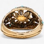 The curved shoulders of the band continue the story of elegance with a complicated foliate design, accented by more turquoise stones and glinting old rose cut diamonds, creating a rich tapestry of colour, texture, and historic charm. A true heirloom-inspired piece, this ring is a celebration of intricate detail and the romantic spirit of a bygone era. Please Note: two of the rose cut diamonds have been replaced with white sapphires.