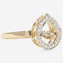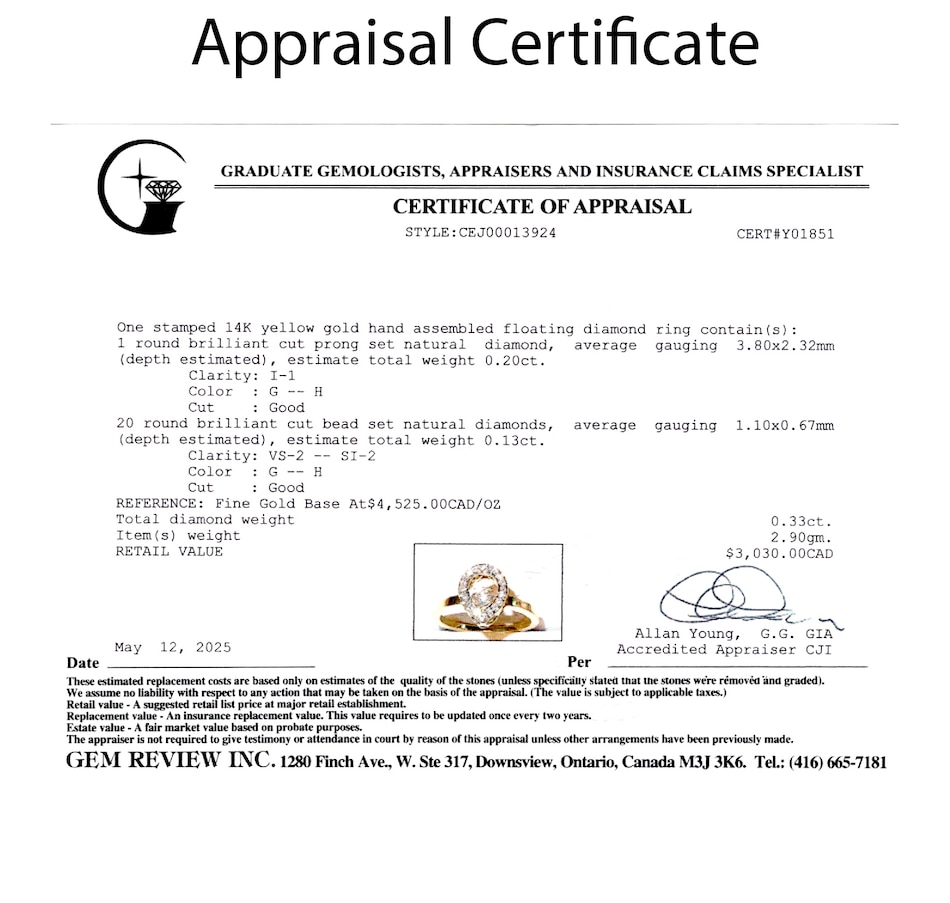 Crafted in glowing 14K yellow gold, this enchanting ring captures the eye with its mesmerizing centerpiece: a 0.20 carat round, brilliant-cut diamond, delicately suspended in a unique "dancing" setting. Encircled by a radiant halo of 20 additional round brilliant cut diamonds, the central stone appears to float effortlessly, catching light with every movement and creating a display of perpetual sparkle. Unlike traditional settings where the diamond is fixed in place, the dancing diamond is ingeniously attached at two delicate points on either side, allowing it to respond to the slightest motion. Whether the wearer is walking, gesturing, or simply breathing, the diamond shimmers with life, seeming to dance with each subtle shift. This innovative technique enhances the brilliance of the stone, creating a dynamic, eye-catching effect that elevates everyday elegance into something truly extraordinary.
