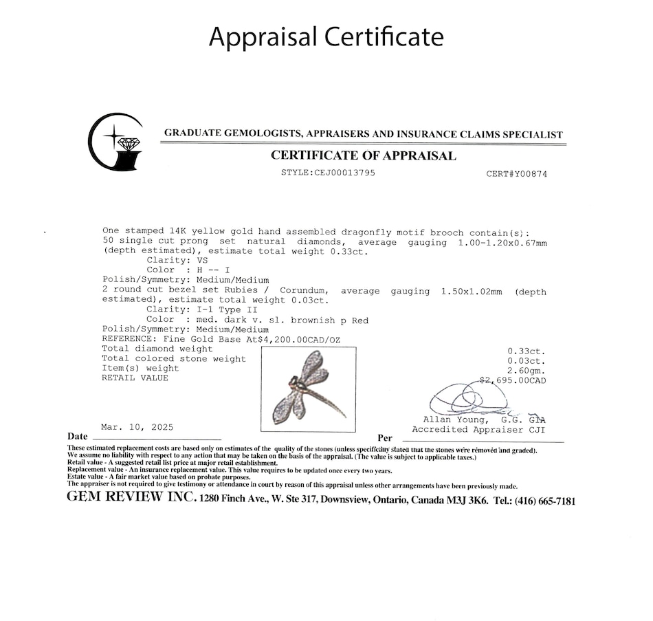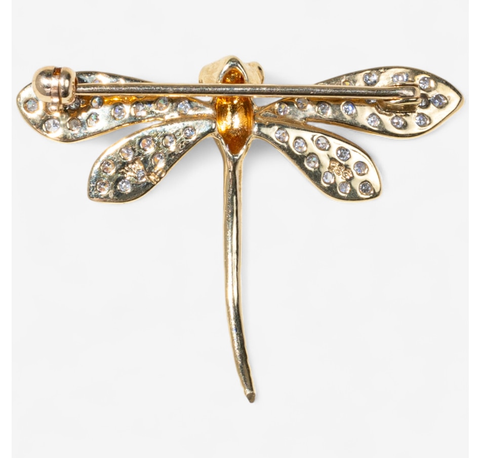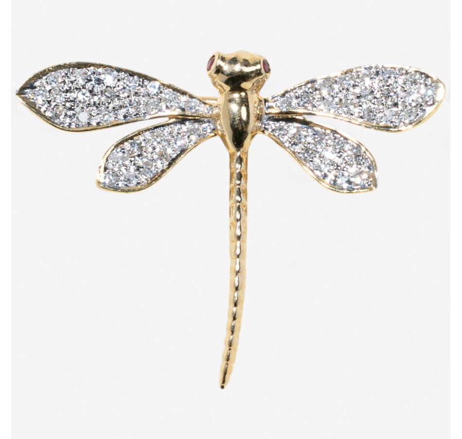 Its eyes are brought to life with two vibrant rubies, offering a striking contrast to the warm glow of the gold and the brilliance of the diamonds. The intricate craftsmanship and graceful silhouette of the dragonfly make this brooch a timeless and enchanting accessory, perfect for adding a dash of sophistication and charm to any ensemble.