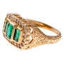 Lying relatively close to the finger, an artful scalloped assemblage of 24 glistening round, brilliant-cut diamonds, together weighing 0.26 carats, creates a soft halo frame and warm backdrop for the three verdant emerald-cut emeralds that glisten and glimmer atop this Art Deco–style dinner ring. The emeralds, combining for 1.27 carats, are placed in an east/west orientation and are clearly defined by the step design of the 14K yellow gold bezel that surrounds each one. A most fascinating undergallery combines engraving with a pierced chevron design leading to an elegant floral engraving on the shank. This arresting assemblage of colour and sparkle is hand-fabricated in 14K yellow gold.