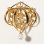This darling pendant/brooch will add a dash of late-Victorian flair to your ensemble. Modest in size, it is big on detail with flowing arches and curlicues, creating a delightful refined pear shape, and studded with forty-six round seed pearls and six deep burgundy garnets. A mirror image of the other, each side is divided by a flower and leaf motif, centering around a small cultured pearl and decorated with sixteen tiny seed pearls. For a bit of motion, a complementing cultured pearl dangles beautifully below. This piece is hand-fabricated in 14K yellow gold.