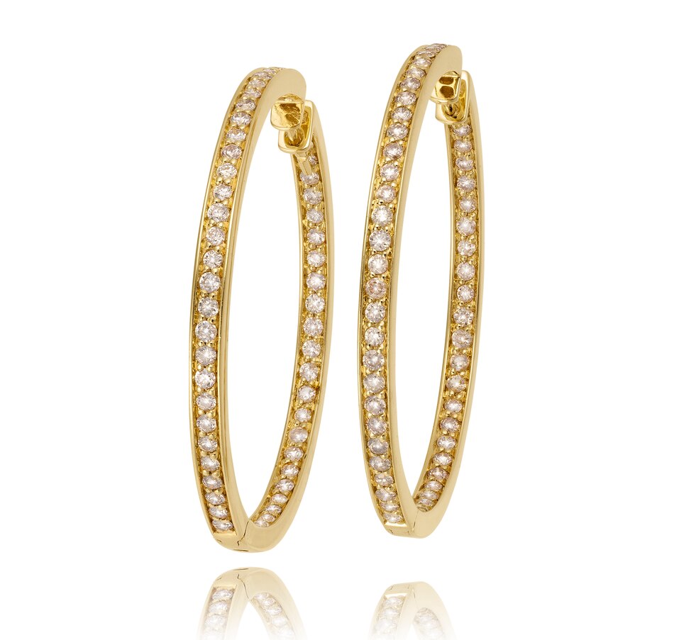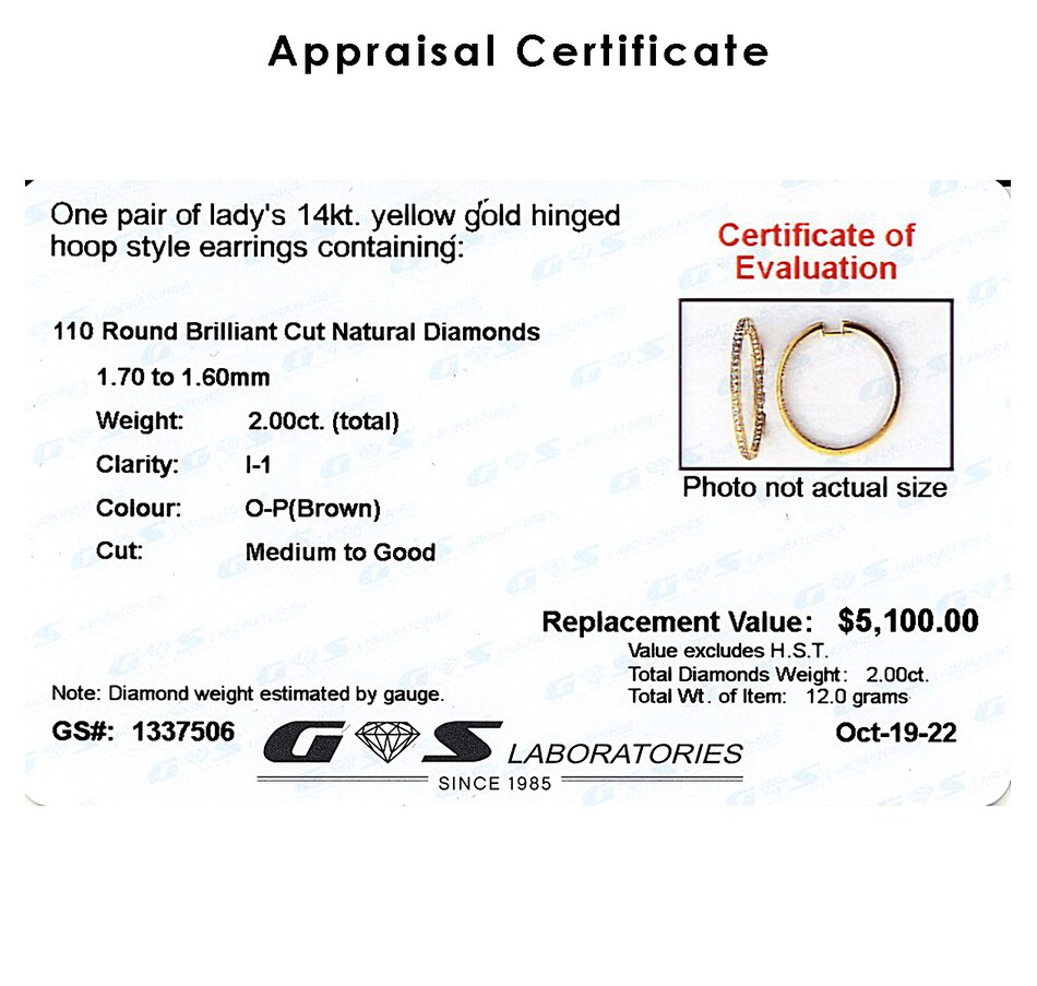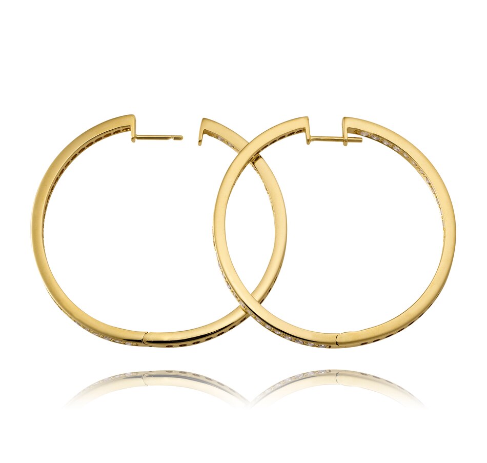 All 110 diamonds have are prong-set and combine to offer a 2.00 total carat weight. The hoops are hinged at the bottom and open readily to allow easy access on the earlobe. A modern-day classic!