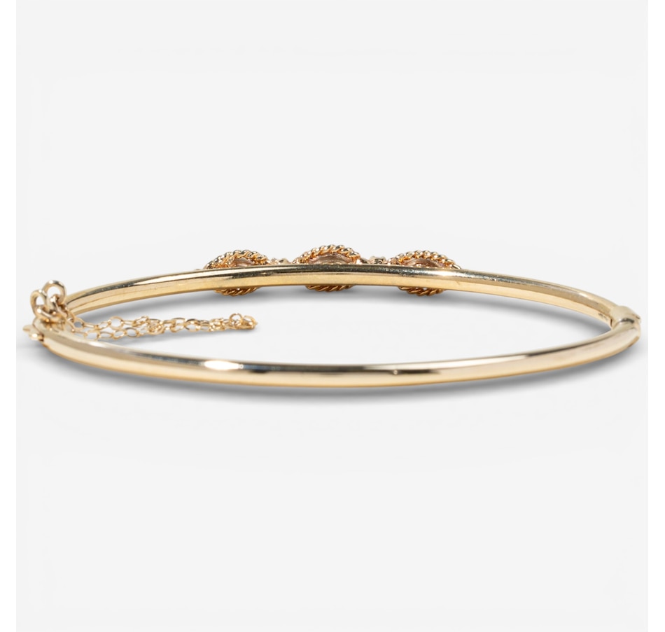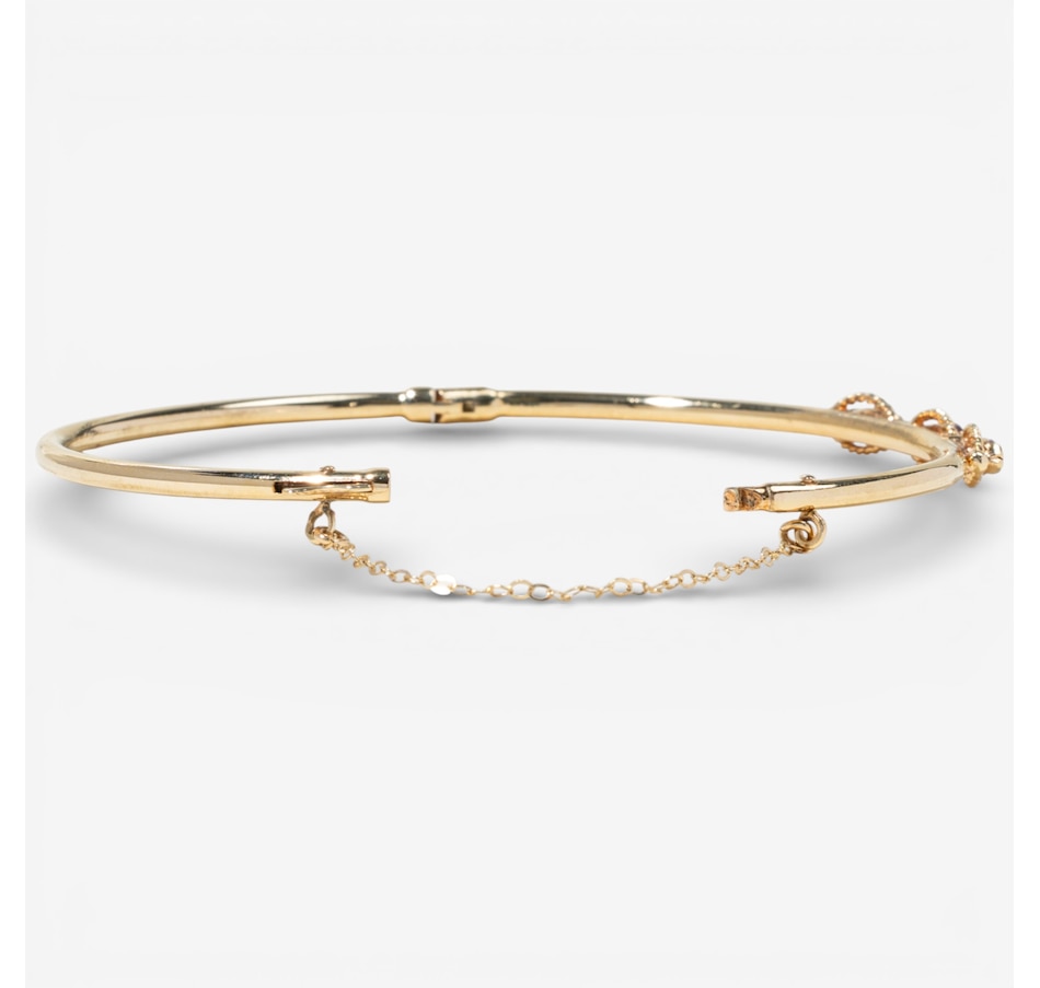 This elegant yellow gold hinged bangle bracelet combines timeless styling with refined gemstone accents. The top half of the bangle features three horizontally set marquise-shaped rubies, each framed with a delicate rope-style gold trim that highlights their rich colour and elongated form. Between each ruby rests a prong-set round diamond, adding brilliant contrast and enhancing the design's rhythmic flow. The bracelet secures with a hidden box clasp for a seamless look and includes a fine safety chain for added peace of mind.