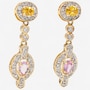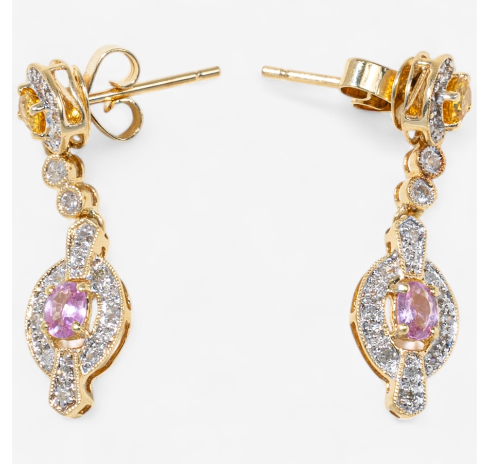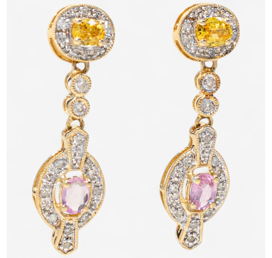 Timeless elegance meets vintage-inspired detail in this exquisite pair of 14K yellow gold drop earrings, each showcasing the vibrant beauty of pink and yellow sapphires accented by shimmering diamonds and intricate craftsmanship. At the top of each earring is an east-west oriented oval yellow sapphire, encircled by a halo of diamonds, forming a classic stud secured with a post and butterfly back for comfort and stability. From each halo, a vertical line of two stacked bezel-set round, brilliant-cut diamonds adds graceful length and subtle sparkle. Suspended below is a larger prong-set oval pink sapphire, also surrounded by a dazzling diamond halo. This focal gem is elegantly framed at the top and bottom by fluted gold segments that extend slightly beyond the circular diamond halo, adding architectural flair and vintage character. Delicate milgrain detailing trims the entire surface of the design, enhancing its old-world charm and elevating the intricacy of each element. Rich in colour, refined in design, and radiant in detail, these earrings offer a perfect balance of sophistication and romantic allure.