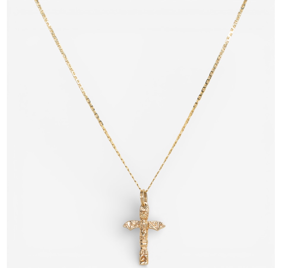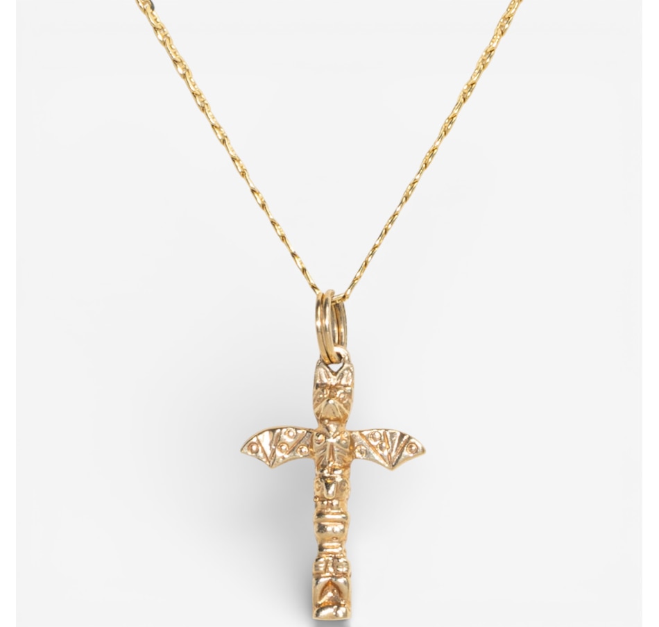 This 14K yellow gold totem pole pendant is a beautifully crafted homage to Indigenous artistry, featuring finely engraved details that capture the depth and storytelling tradition embodied in classic totem pole designs. The pendant showcases stacked symbolic figures, each rendered with precision, highlighting the expressive faces, flowing lines, and purposeful shapes that define this enduring art form.