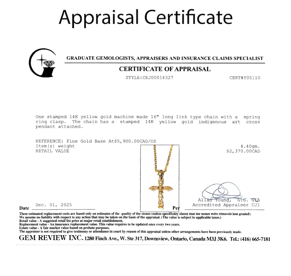 While individual symbols vary by nation, family, and carver, common figures such as the Eagle, Raven, Bear, or Wolf often embody qualities like leadership, wisdom, strength, and protection. This pendant honours that legacy with care and artistry, offering a wearable representation of a deeply meaningful cultural tradition. The piece is accompanied by a 16" 14K yellow gold marine link chain, secured with a spring-ring clasp.