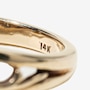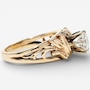 The underside of the setting is hollowed, allowing light to enter freely and illuminate the diamond from every angle. The yellow gold band unfolds into a scrolling leaf-and-swirl motif. A ribbed swirl gently curves around the base of the prongs, appearing to cradle the diamond in a graceful embrace. On either side, two ribbed leaves rest at an angle beside each scroll, their subtle layering adding depth and dimension. Extending outward from the leaves, a pierced swirl design, reminiscent of delicate twigs, connects the motif to the rest of the band, uniting the natural and sculptural elements in perfect harmony.