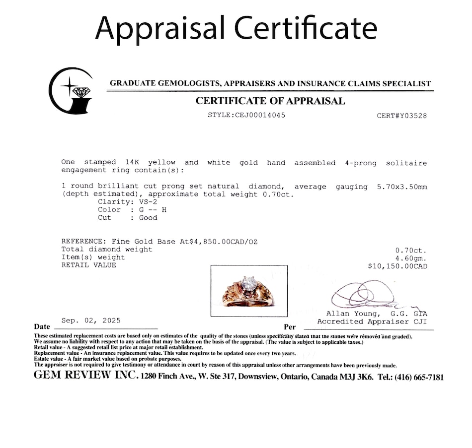 This organic 14K gold diamond solitaire ring combines classic elegance with nature-inspired artistry. At its heart gleams a 0.70-carat round brilliant-cut diamond, securely set in a raised six-prong white gold setting that lifts the stone to capture maximum light and brilliance.