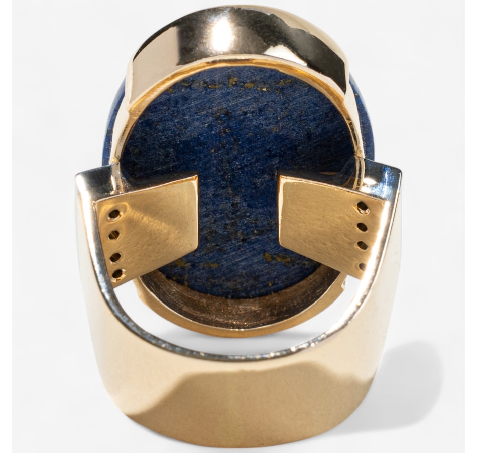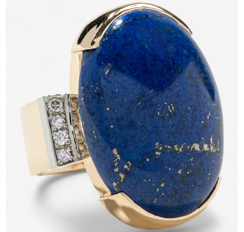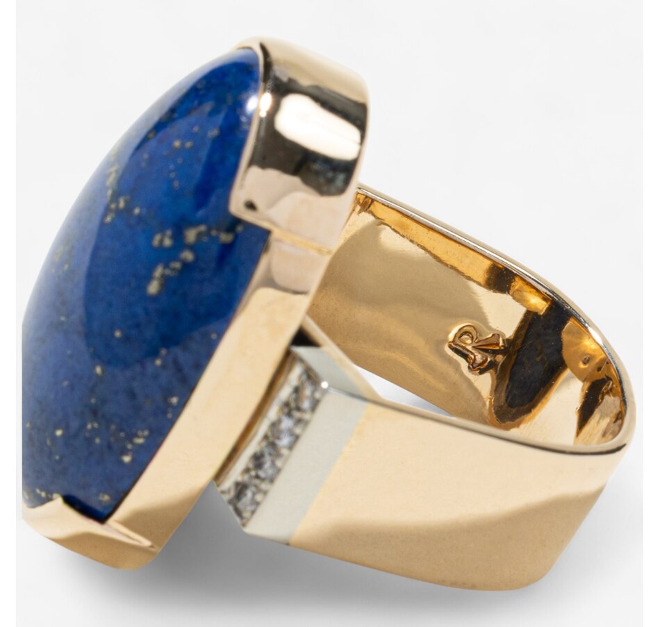 Like a starry night sky, this large lapis lazuli gemstone gleams with a highly distinctive deep blue aesthetic complete with golden flecks of pyrite. This magnificent gemstone rests upon a platform and is embraced by a semi-bezel setting that wraps around both the top and bottom revealing the geometrically sloping shoulders. Four round, brilliant-cut diamonds, set in white gold, accent the top of each column created by the shoulder placement. A Euro-shank band acts to support the ring upright on the finger. This beautiful modern vintage circa 1960s ring is expertly fabricated in gold.