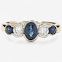This contemporary ring showcases a striking design with a central oval blue sapphire, radiating deep, vibrant colour. Flanking the sapphire are two dazzling diamonds, one on each side, adding a touch of brilliance and elegance. Continuing the sophisticated pattern, two additional sapphires in a graduated 5-stone across style enhance the ring’s allure. All stones are semi-bezel set in cool, sleek white gold, perfectly complementing the rich yellow gold shank, which offers a warm contrast to the overall design. This fusion of precious stones and metals creates a timeless, yet modern piece that works in perfect harmony, effortlessly blending colour, light, and texture.