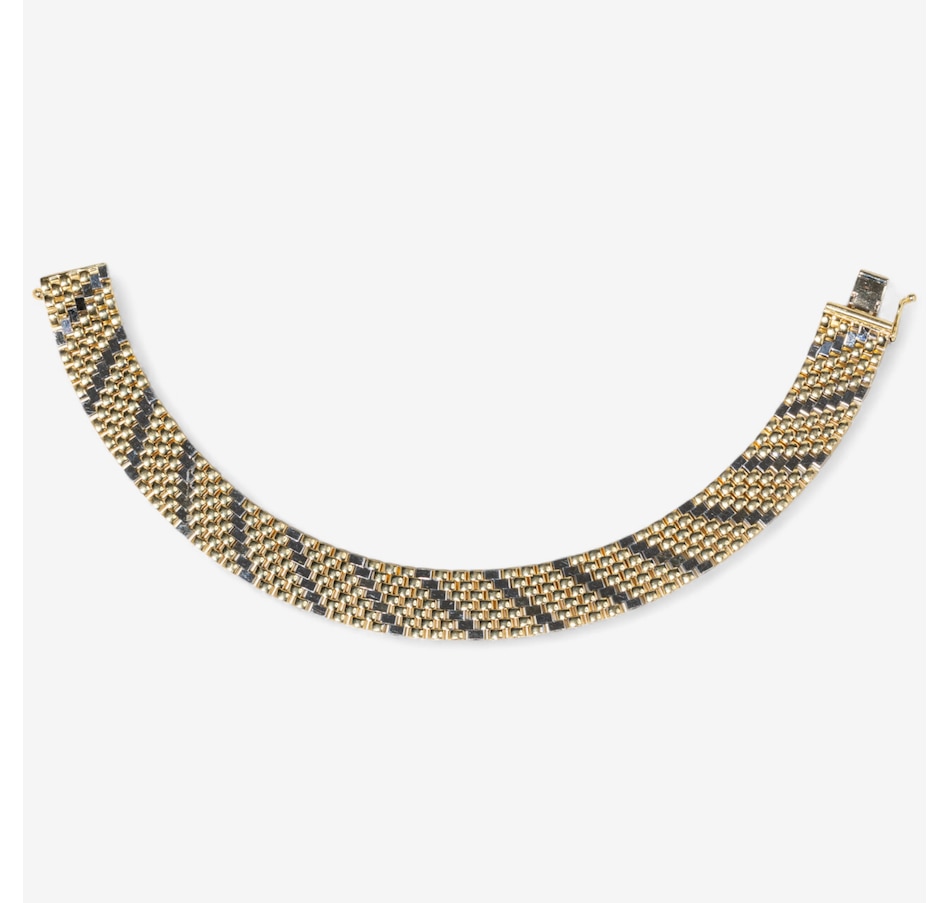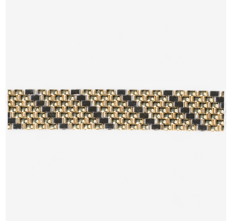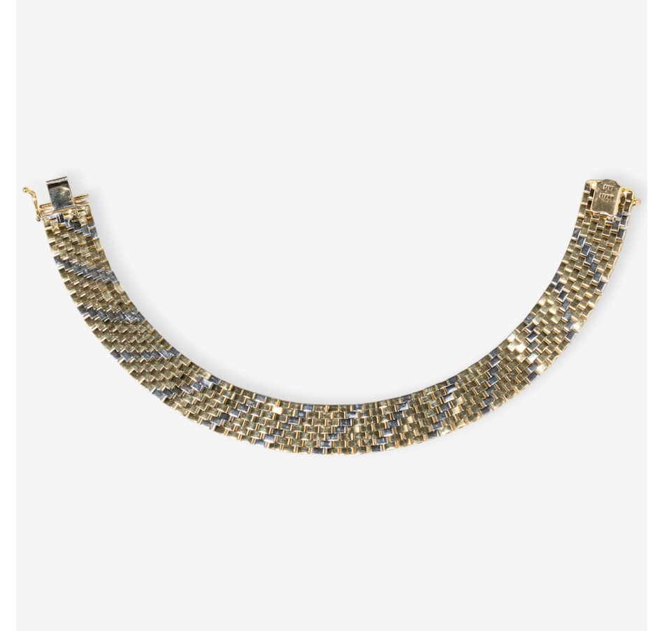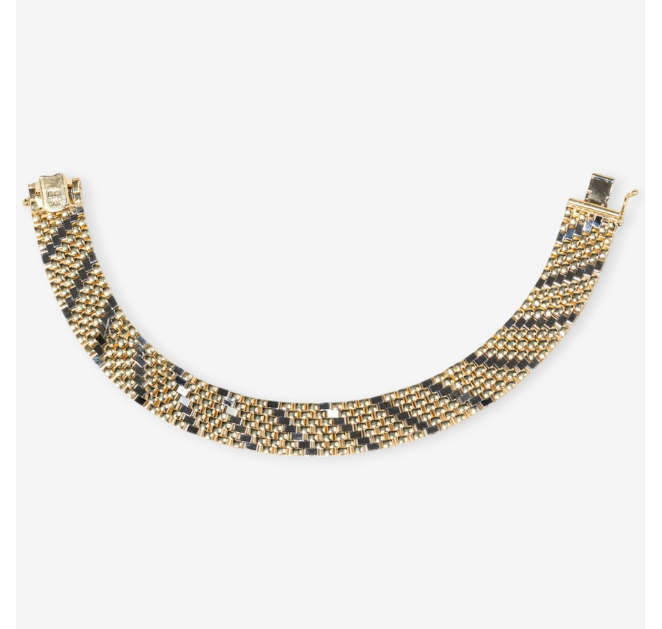 Crafted in Italy, this exquisite yellow gold bracelet showcases a striking combination of design and craftsmanship. It features a seven-row width with a combination of yellow gold puffed panther links and flat rectangular white gold links. Angled in a dynamic pattern, each section contains three rows of yellow gold panther links followed by a single row of white gold flat links, creating a sense of movement and texture. The bracelet is securely fastened with a box clasp and an added figure ‘8’ safety lock, ensuring both elegance and security.