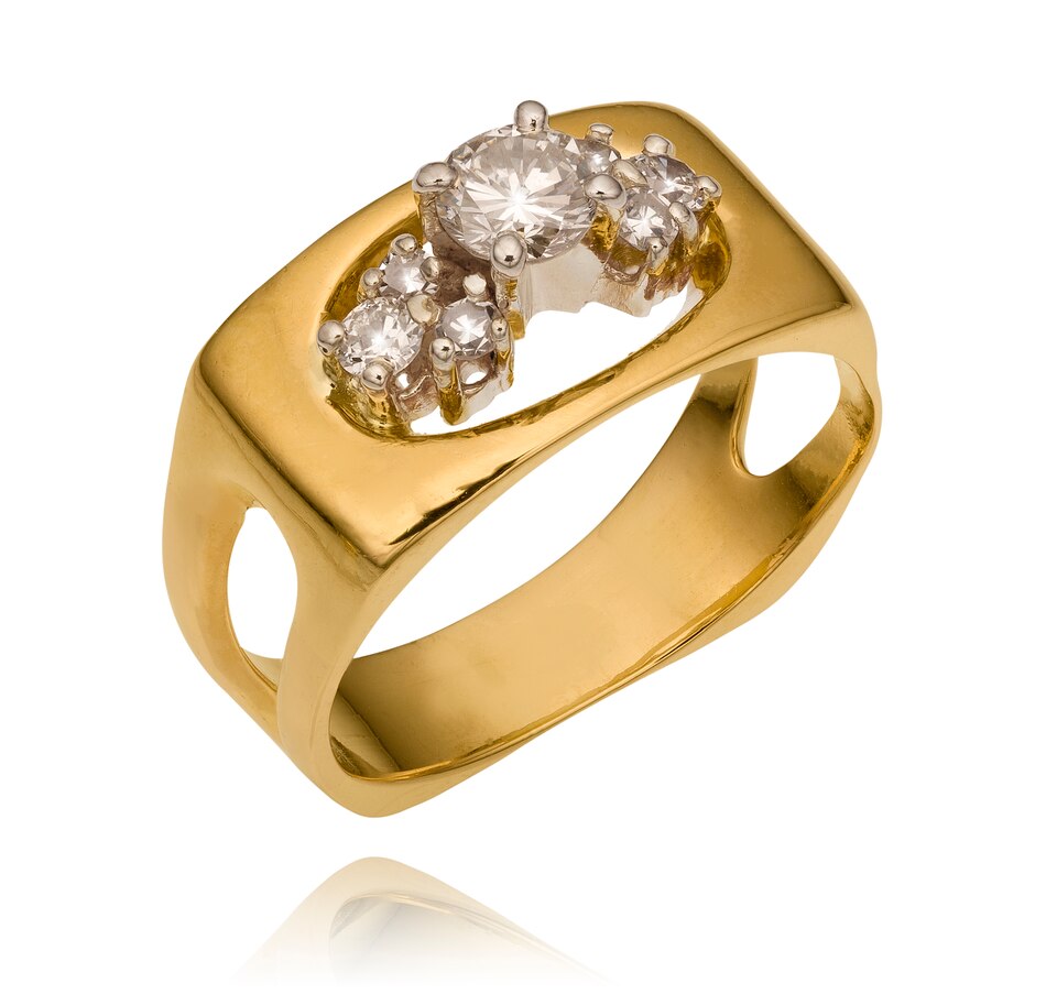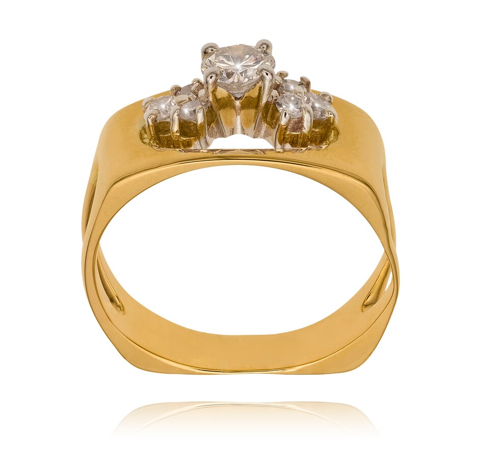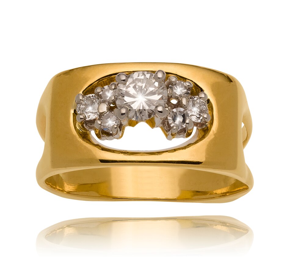 This diamond ring is unique in its setting. The white gold middle portion is designed with a classic larger diamond in the middle and a pyramid of three smaller diamonds on either side. What makes it so unique is that the diamonds bridge the large oval opening situated within a yellow gold squared-off band. Two additional tapered oblong openings are cut (one from each side), and the bottom of the band is designed with a Euro shank providing a retro '60s feel. The 0.36-carat middle diamond is prong-set to rise above the three stones on each side. Combined, the total diamond weight is 0.56 carats.