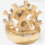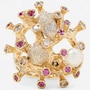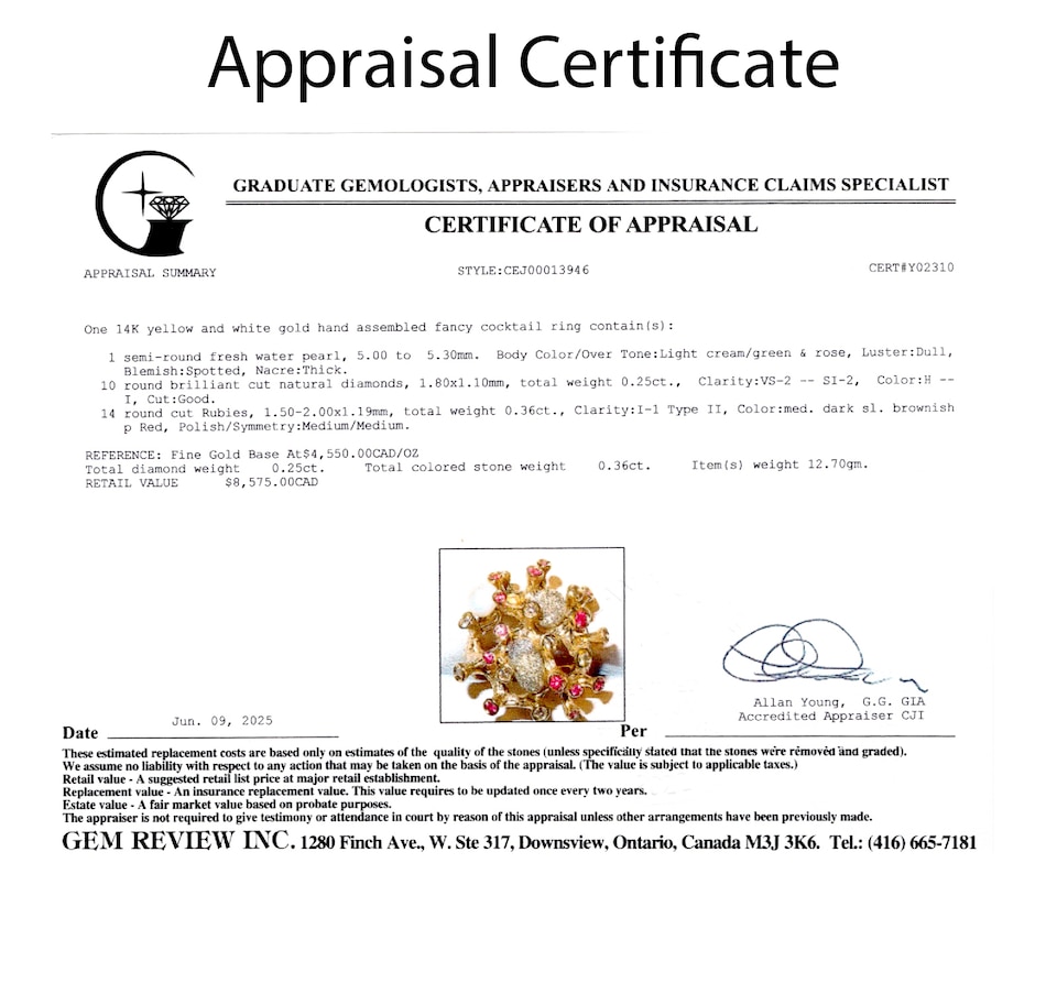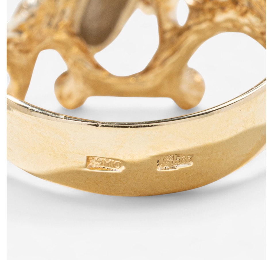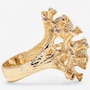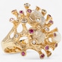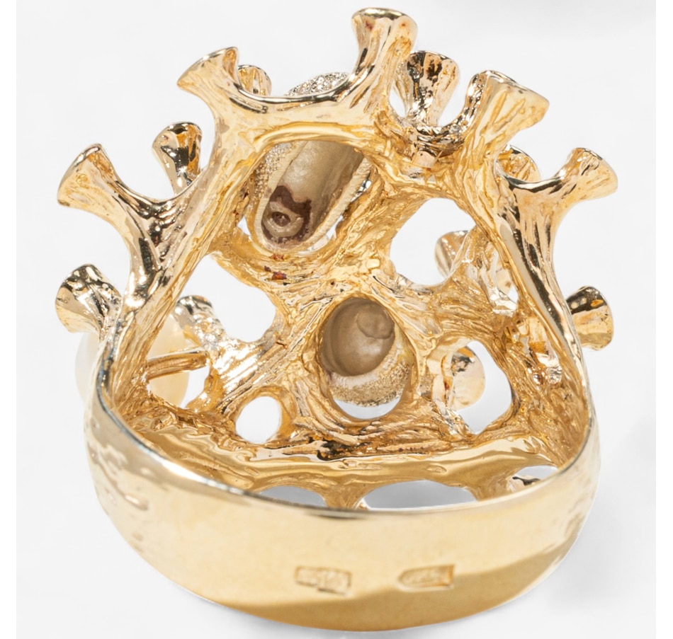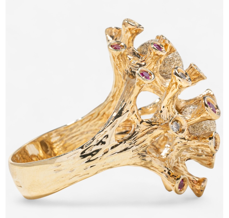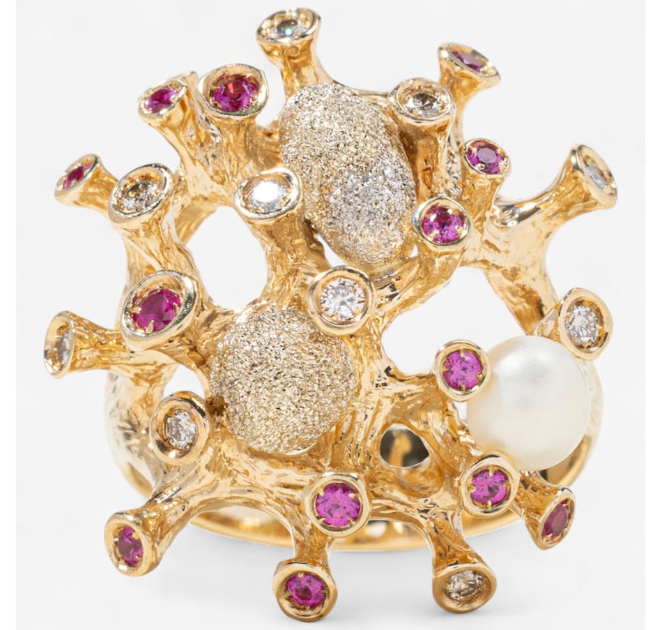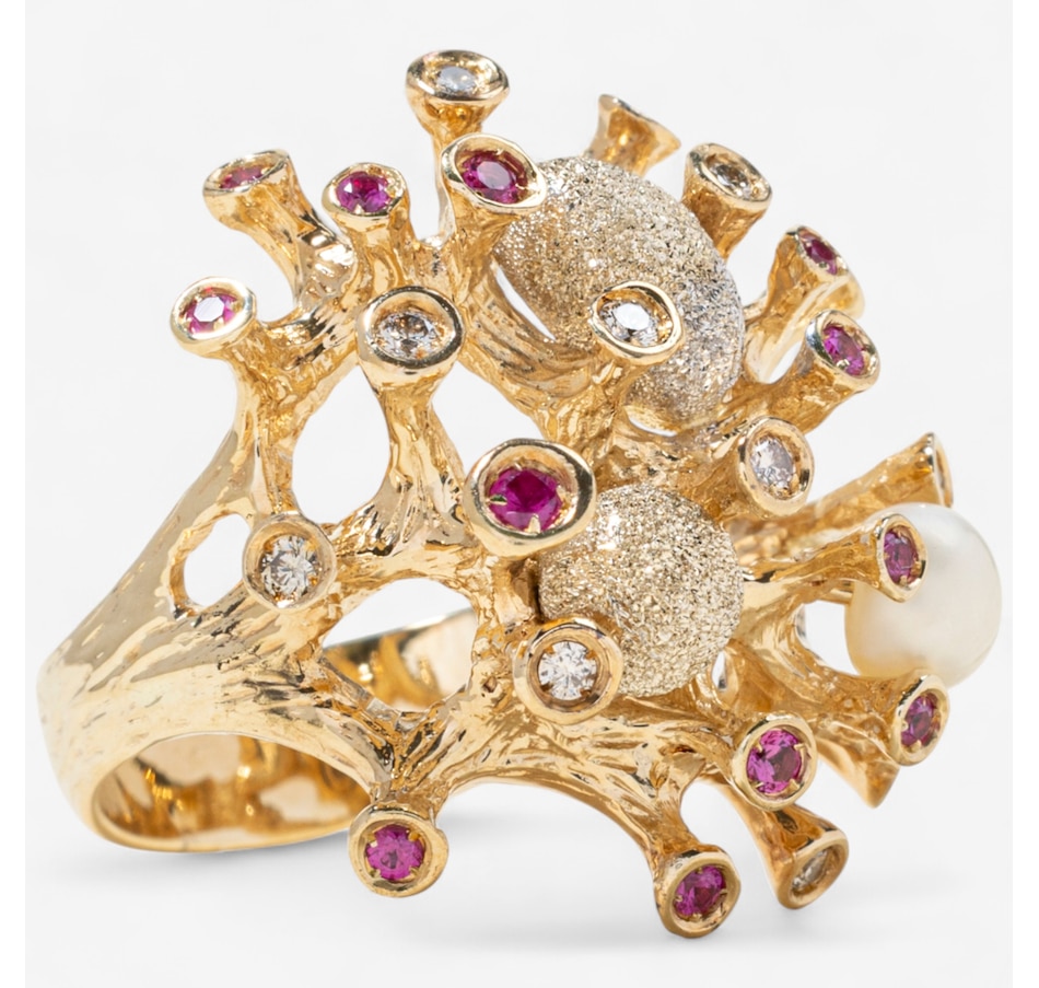 Evocative of a living coral reef, this extraordinary 14K predominately yellow gold ring captures the wild, organic beauty of the ocean floor through dynamic form and intricate detail. The surface undulates with 24 rounded, branch-like gold columns—each rising like tentacles from a reef, bezel-set with alternating rubies and diamonds. The 14 rubies glow with deep red vibrance, while the 10 diamonds add brilliant contrast, sparkling like sunlight filtering through water. Two freeform orbs, one round, the other oval, nestle between the golden tentacles, crafted in textured, stippled white gold that shimmers with a diamond-like glitter. These elements evoke underwater sea forms or glistening marine stones, adding visual intrigue and a contrasting brightness to the warm gold. On one side of the design, a semi-round freshwater pearl (measuring approximately 5–5.3mm) emerges organically from the setting, echoing the natural treasures found within coral beds. The entire ring is sculpted with an intricate bark-like texture and thoughtfully carved negative space, giving it a light, airy feel despite its bold presence. The back of the band remains smooth and untextured to allow for easy sizing. A wearable piece of modern sculpture, this ring speaks to nature’s chaos and beauty, melding gem and metal in a symphony of organic elegance.