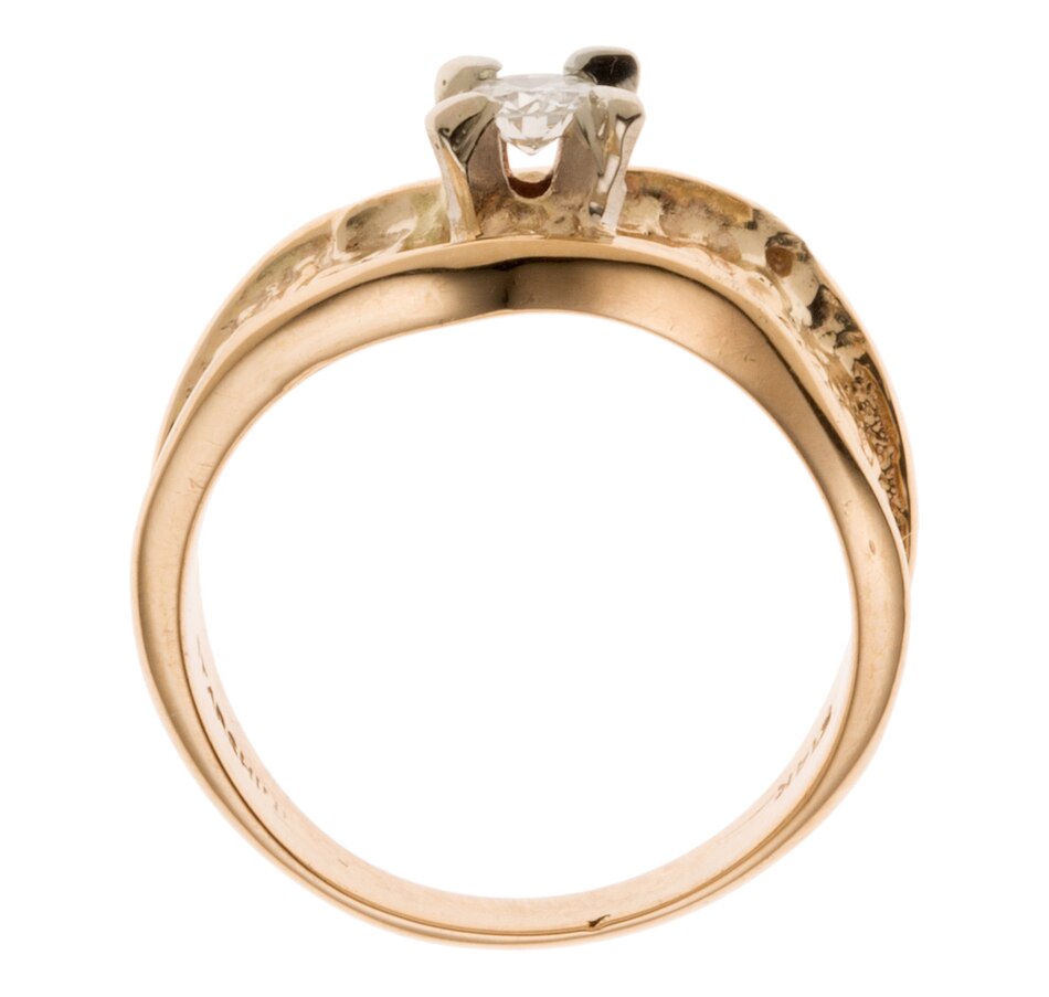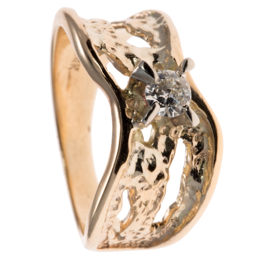 It'll be hard to tear your eyes away from your hand with this stunning, organically-styled diamond ring. It is fashioned with beautifully textured and randomly pierced 14K yellow gold shoulders, framed by a thin, raised border of the same gold with a bright high-polish finish. The undulating shape of the ring is finished with a shimmering 0.20 carat old European-cut diamond. A perfect accessory for a stylish night out.