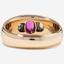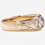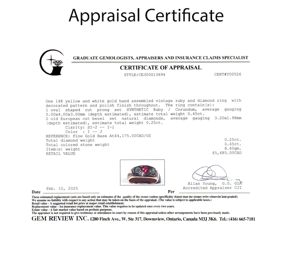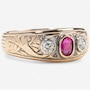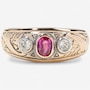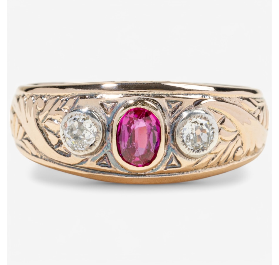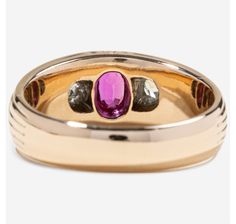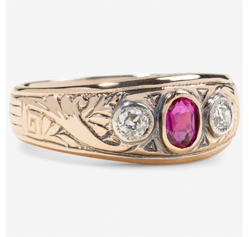 This gemmy vintage jewel centres on a bright, deep-red, 0.45 carat oval synthetic ruby. The gemstone is bezel set, in yellow gold, between a sparkling pair of old European-cut diamonds, bezel set with milgrain trim in white gold. The gracefully curved bombé-shaped 14K yellow gold mounting is lavishly ornamented in consummate Edwardian style (circa 1901 - 1915) with careful attention paid to each and every decorative detail. A truly superb and stunning vintage jewel.